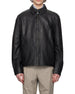 This jacket is a sophisticated outerwear staple; the back is made of three pieces of leather in a rich brown or black. The design features a sleek, minimalist silhouette with a standard collar and a secure front zip fastening. The hem has custom buttons for adjustable tightness.