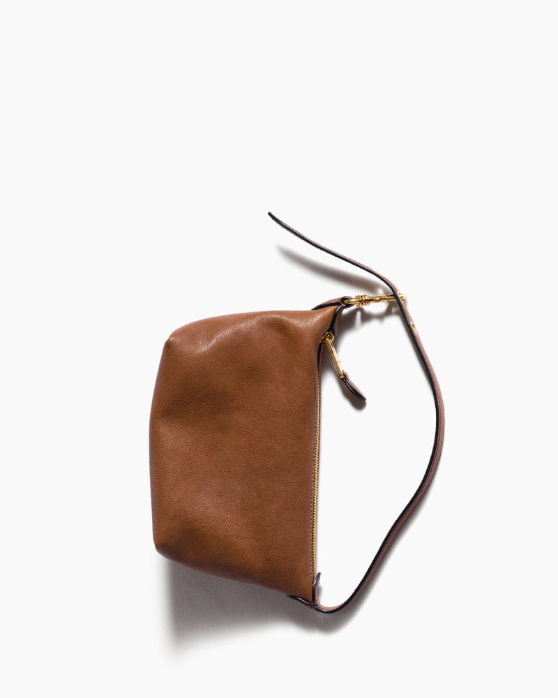 Defined by its compact silhouette and supple texture, this pouch is crafted from soft nappa genuine leather. It offers a blend of minimalist elegance and practical design, featuring a convenient handle with a snap-hook detail. The relaxed structure makes it a perfect companion for keeping essentials organized with an effortless, sophisticated touch.