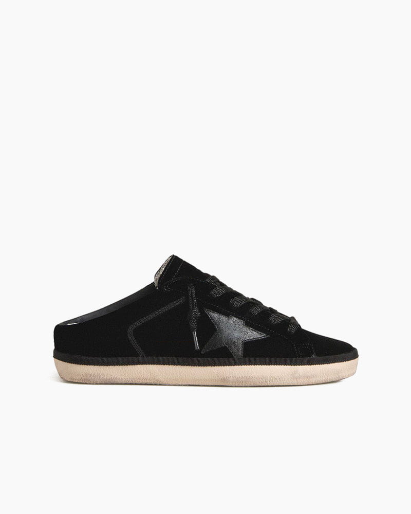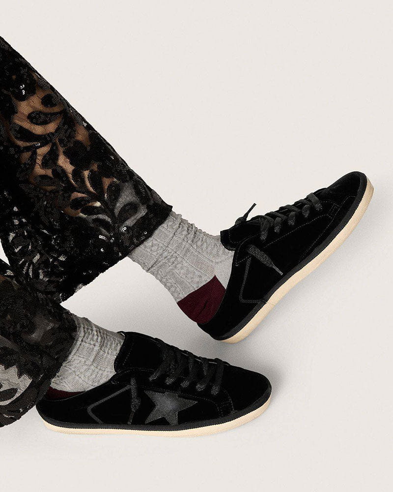 This design reimagines an iconic sneaker in a chic sabot silhouette, blending casual comfort with luxurious texture. Handmade in Italy, the shoe features a rich black velvet upper accented by a black leather star with micro-glitter for a touch of sparkle. The monochromatic look is completed with black trim and shimmering black laces, all treated with a vintage finish..