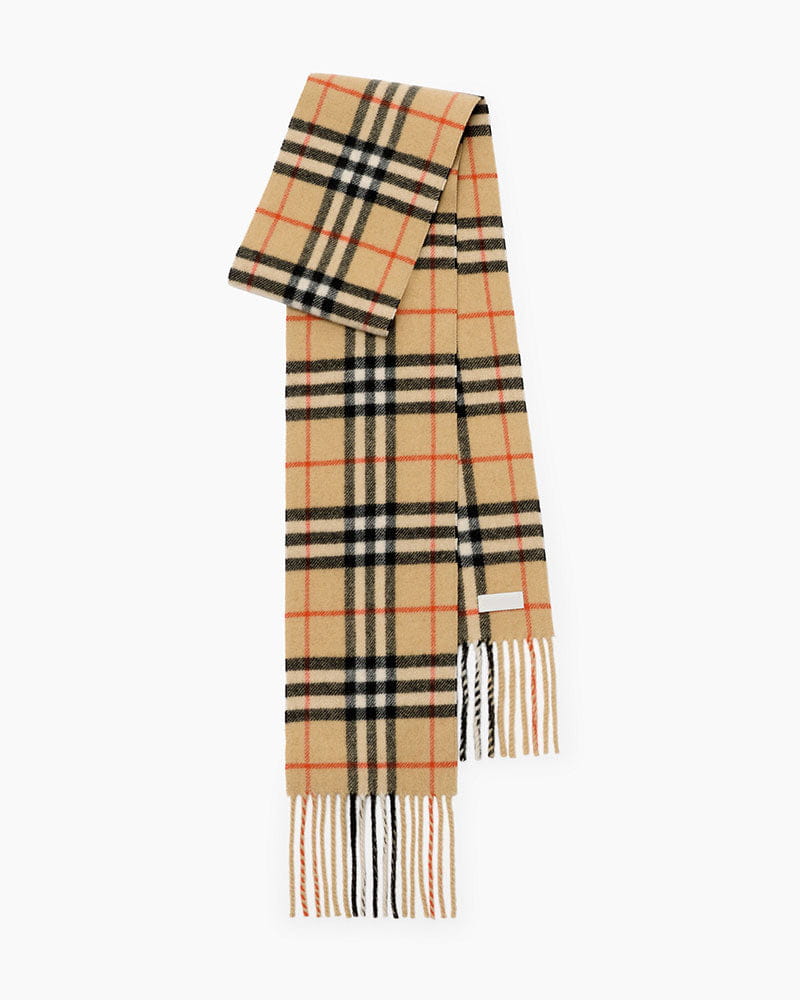 This iconic accessory is woven from cashmere by knitting. The creation process involves various steps to raise the nap, resulting in a unique natural lustre and an ultra-soft finish. Featuring the signature Check, it is finished with classic fringing at both ends.