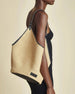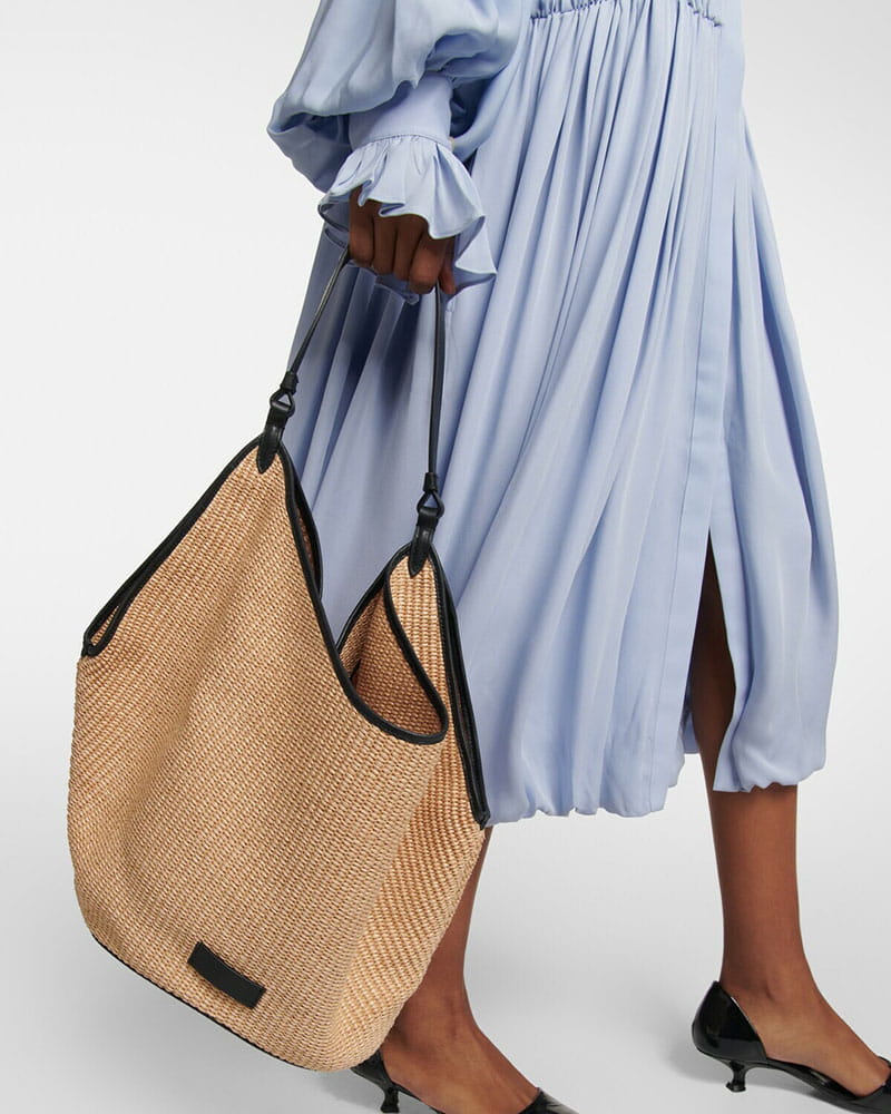 Lightweight yet distinctive, this medium raffia tote bag pairs a relaxed open-top silhouette with refined contrast trim for an effortlessly elevated look. Its roomy shape, top handle design, and self-tie detail make it a stylish everyday carryall with natural texture and understated charm.