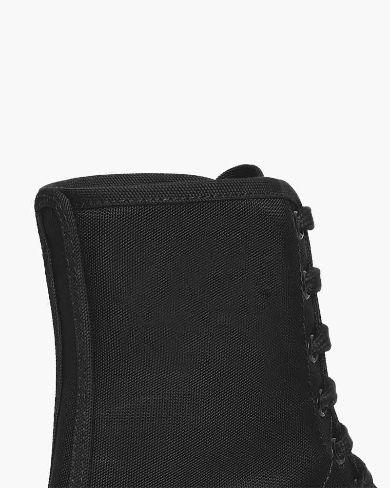 These rugged lace-up boots combine a utilitarian aesthetic and are crafted from durable and breathable canvas material. The design is anchored by a thick rubber lug outsole with Chunky heels, providing a bold silhouette and substantial lift, making a statement from every angle.