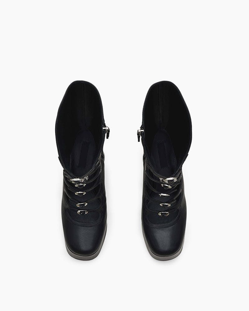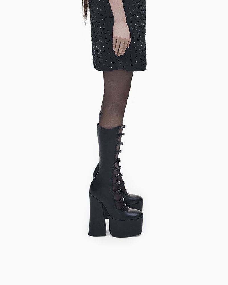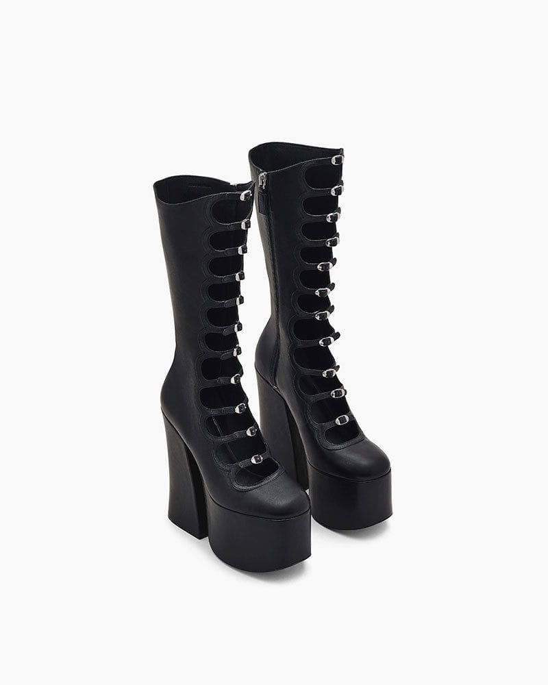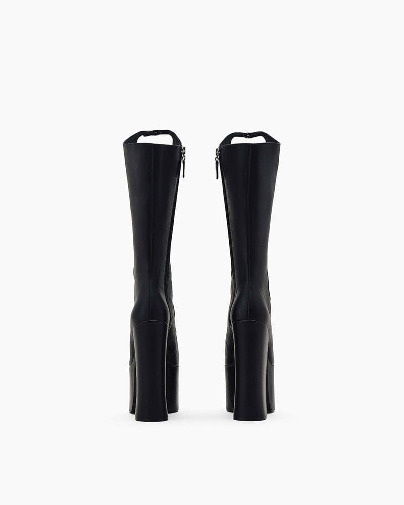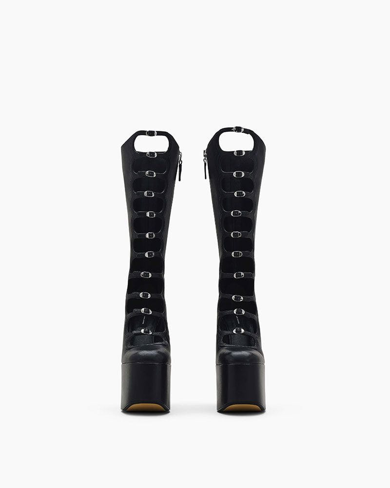 First introduced on the runway, these striking boots are reimagined from the original 6" platform icon into a bold knee-length silhouette. Defined by their rounded toe and multi-strap front, they bring a daring edge to any look.