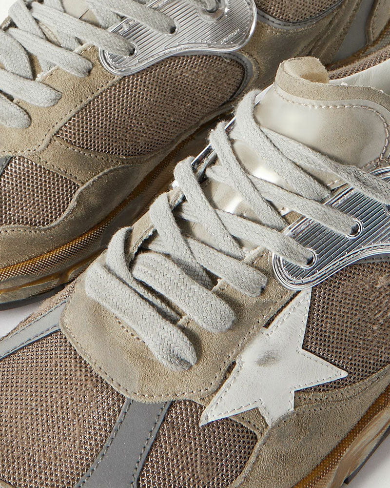 These distinctive running-style sneakers are a tribute to vintage athletic footwear, redefined with a contemporary, hand-finished aesthetic. They feature a mixed-material paneled construction and intentional distressing, offering a unique blend of nostalgic design and modern, casual appeal.