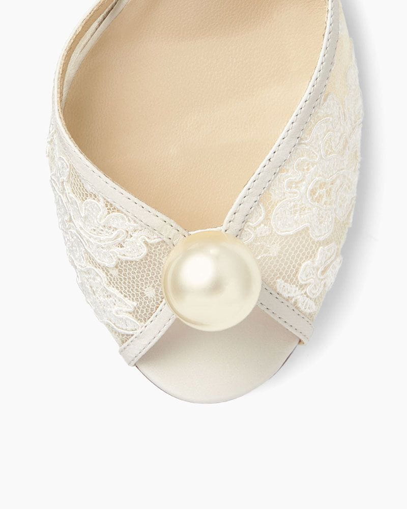 Romantic and refined, these ivory lace sandals embody timeless bridal elegance. Crafted in delicate floral lace with a soft sheen, the design features an elegant V-cut peep toe adorned with a single oversized pearl — a graceful detail that adds subtle sophistication. Perfect for weddings or special occasions, these heels combine beauty and balance in every step.
