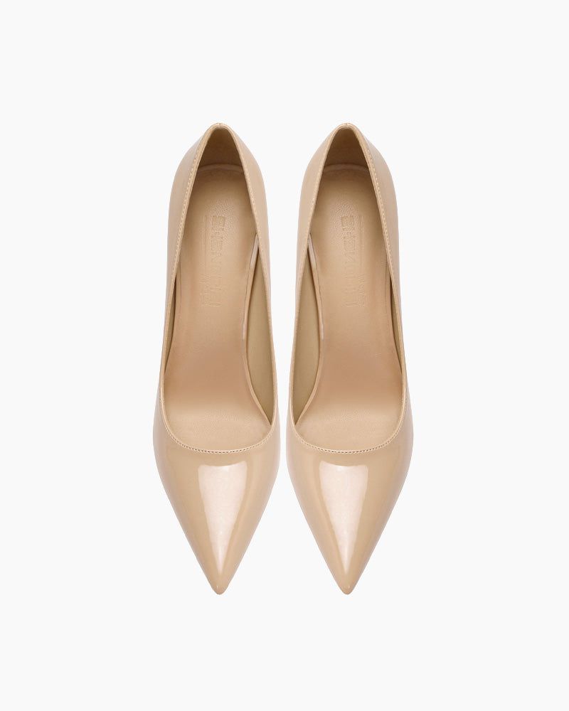 Minimalist yet refined, these pointed-toe pumps are crafted in high-gloss microfiber leather. With a delicately curved topline, a low-cut vamp, and a signature red sole, they embody timeless feminine elegance.