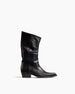 A refined take on the classic Western silhouette. Crafted from Microfiber Leather, this boot blends rustic charm with sharp sophistication. Its snip-toe shape, angled shaft, and patinated leather heel evoke timeless craftsmanship and understated confidence.