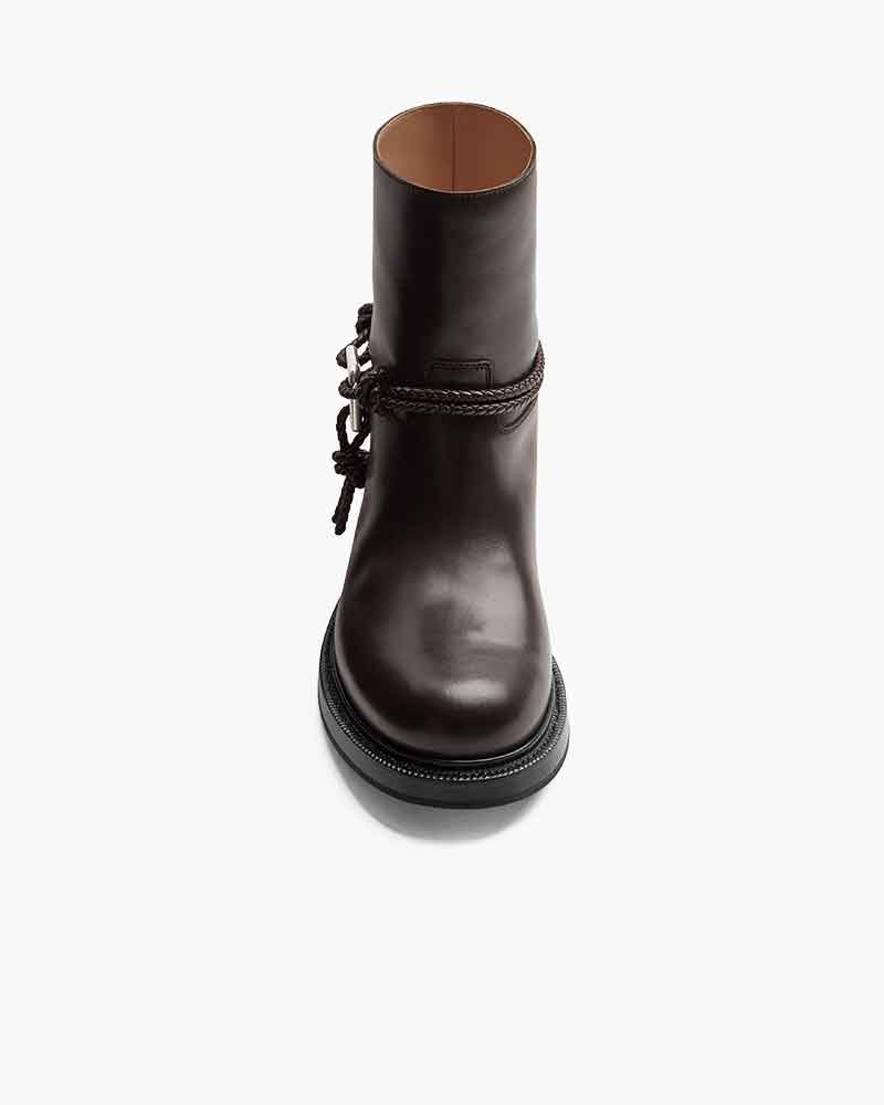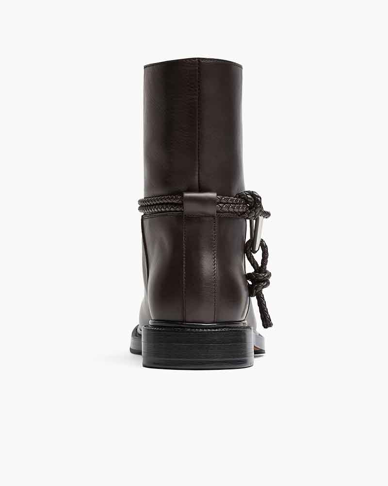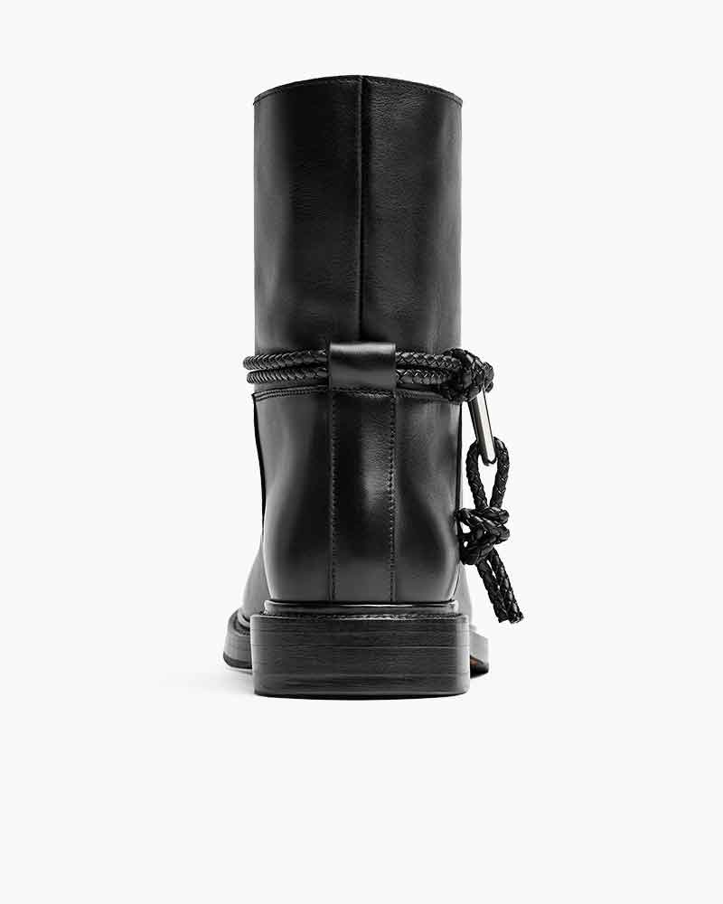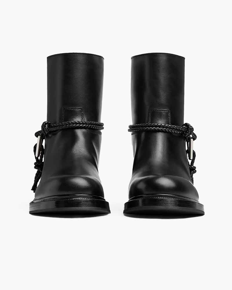 Exemplifying modern Italian luxury, these ankle boots are crafted from premium genuine leather. The design is defined by distinctive coaxial detailing that wraps around the ankle, anchored by a signature silver-finish metallic triangle element. Built with durable Goodyear welt construction, these boots merge architectural aesthetics with lasting quality.
