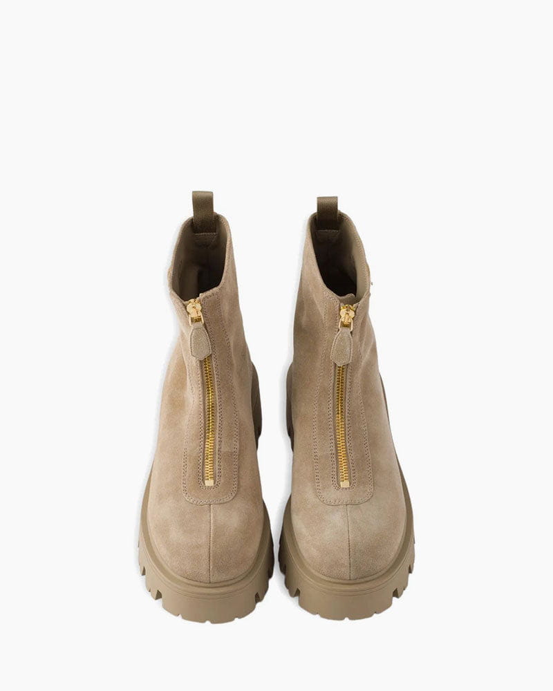 Combining urban utility with luxury texture, these ankle boots are crafted from velvety suede genuine leather in a versatile brown hue. The design is defined by a modern front zip fastening and a robust, chunky lug sole, while a tonal metal triangle logo adds a signature geometric touch to the shaft. Effortlessly stylish, they offer a contemporary silhouette grounded in comfort.
