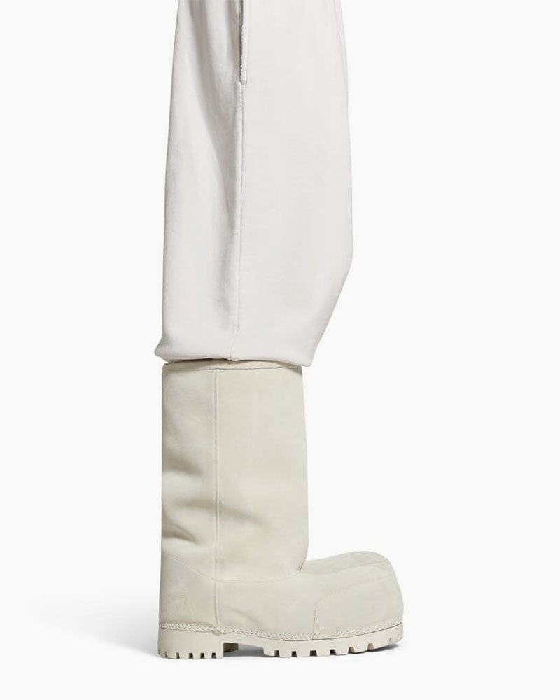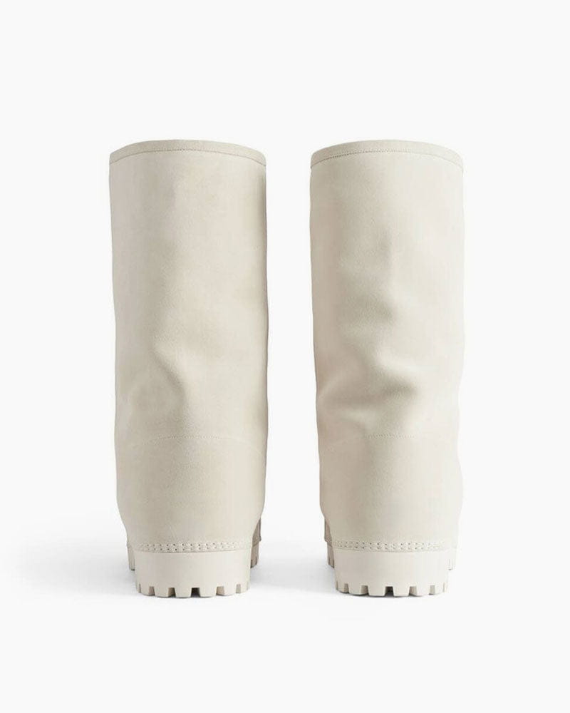 Crafted from smooth split calfskin and durable synthetic material, these high boots in clean white bring a bold, sculptural edge to any look. The extra-round toe and chunky rubber sole create an exaggerated, fashion-forward silhouette that pairs effortlessly with everything from slim denim to oversized outerwear.