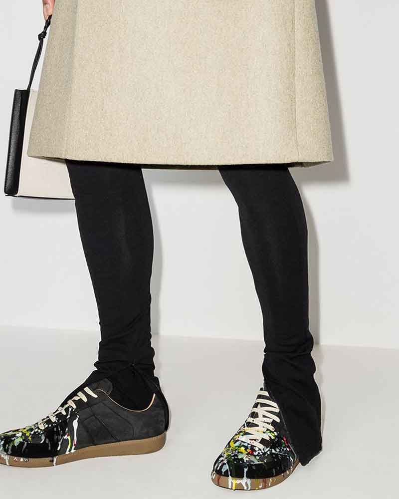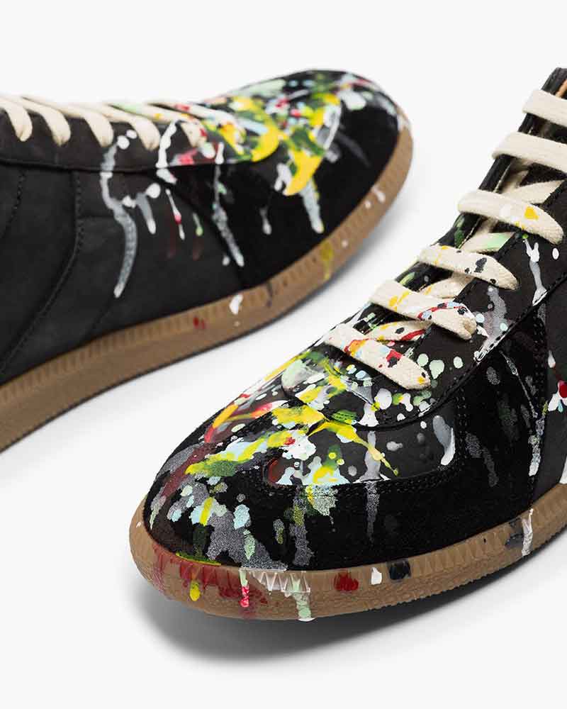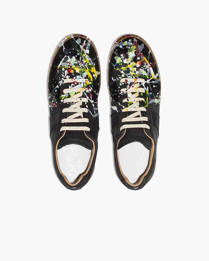 Crafted in smooth black leather with hand-applied paint splatter accents, these sneakers blend artistic expression with a clean, retro-inspired silhouette. The multicolored splashes create a bold contrast against the refined upper, while the rubber sole and classic lace-up design ensure comfort and wearability. Designed for those who appreciate understated style with a creative edge, they bring a unique character to everyday looks.
