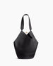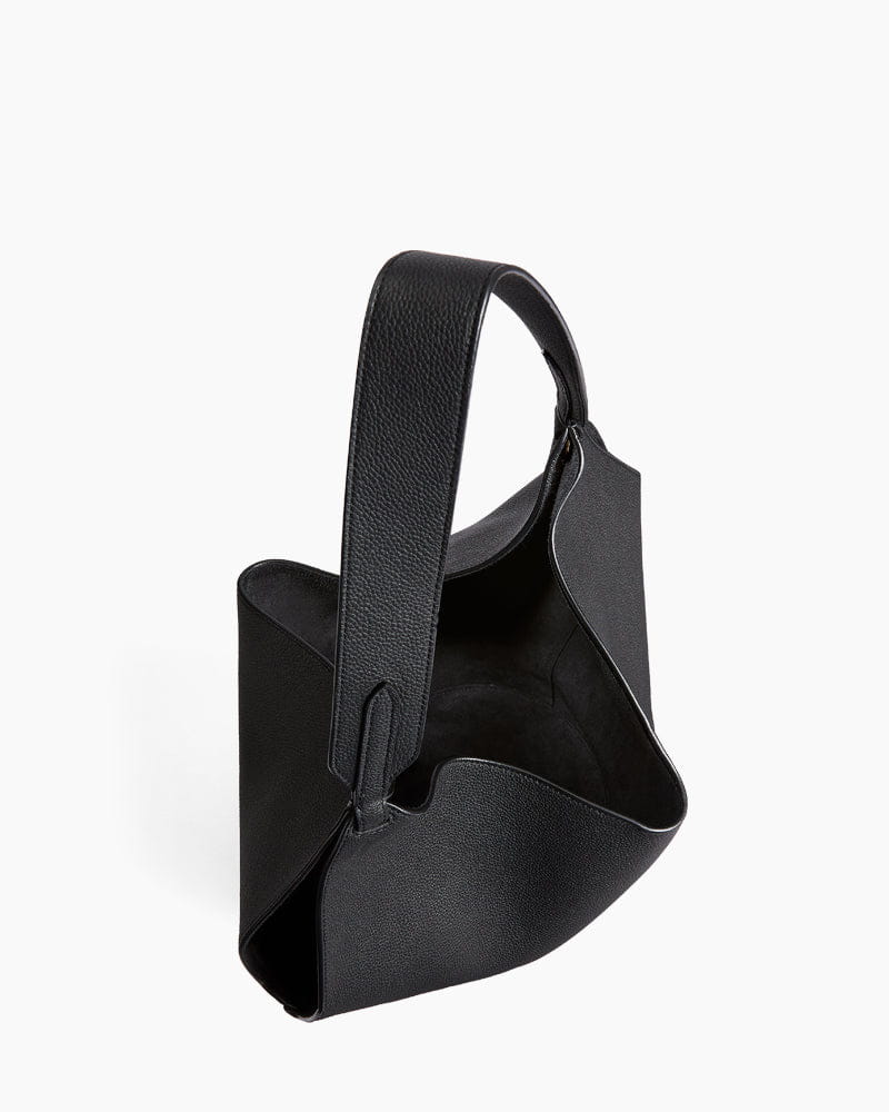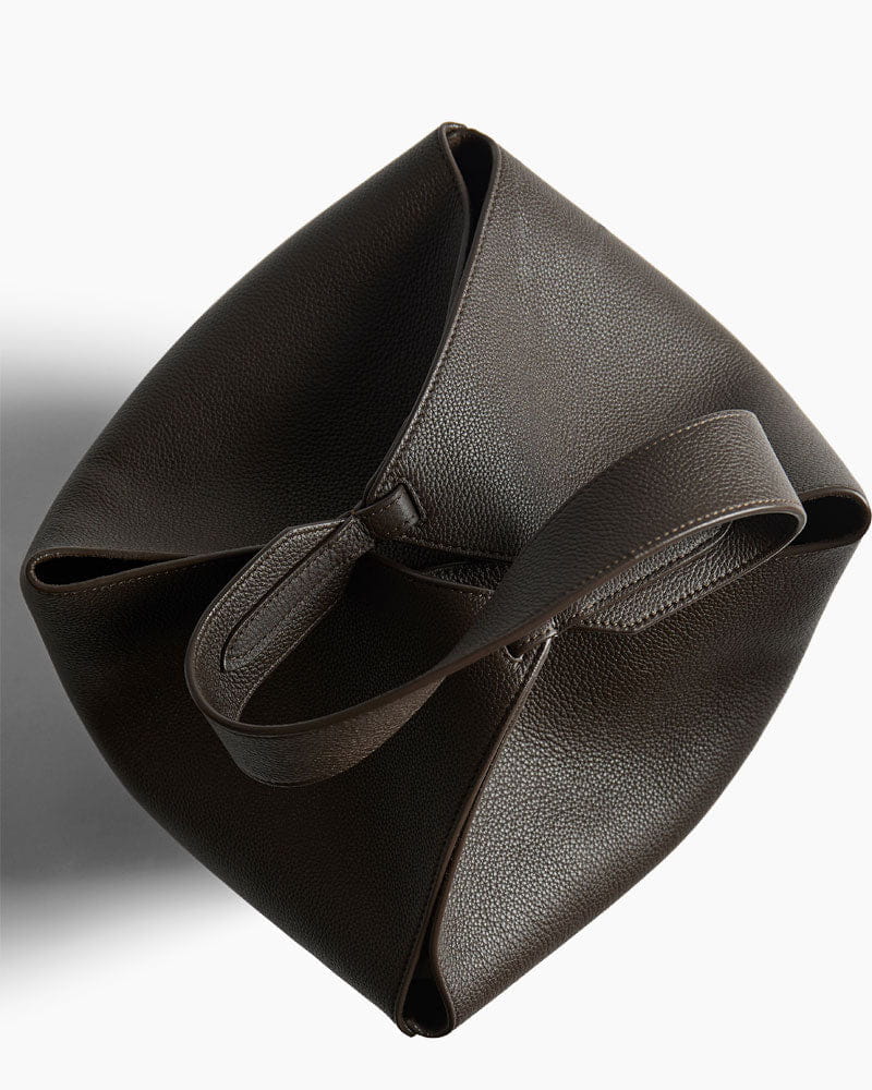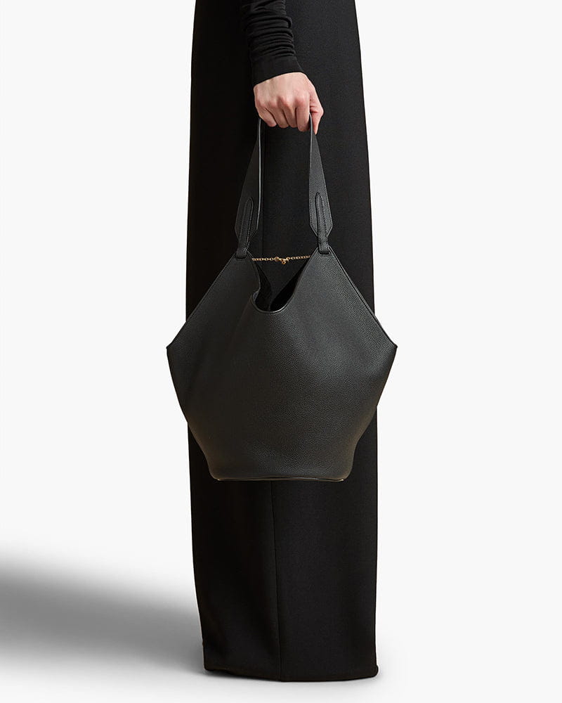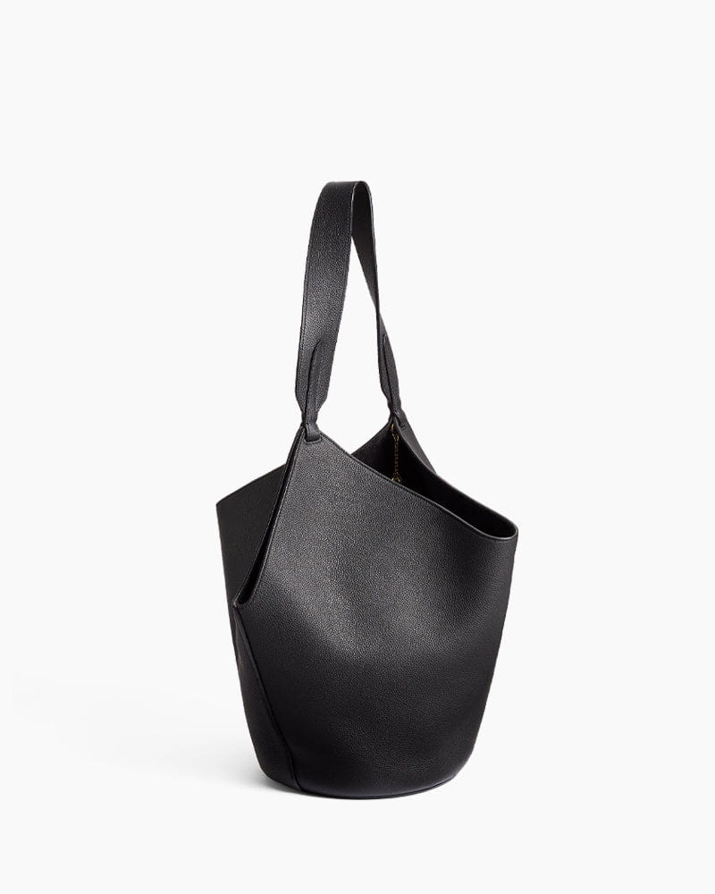 This tote features a unique scarf-inspired silhouette, crafted from smooth genuine leather for a fluid, sculptural look. Designed to be especially lightweight, the bag is constructed with a stable rounded base and a wide, integrated handle that rests comfortably on the shoulder or in hand, while the open top is secured by a delicate, jewelry-like gold chain toggle closure on the interior.