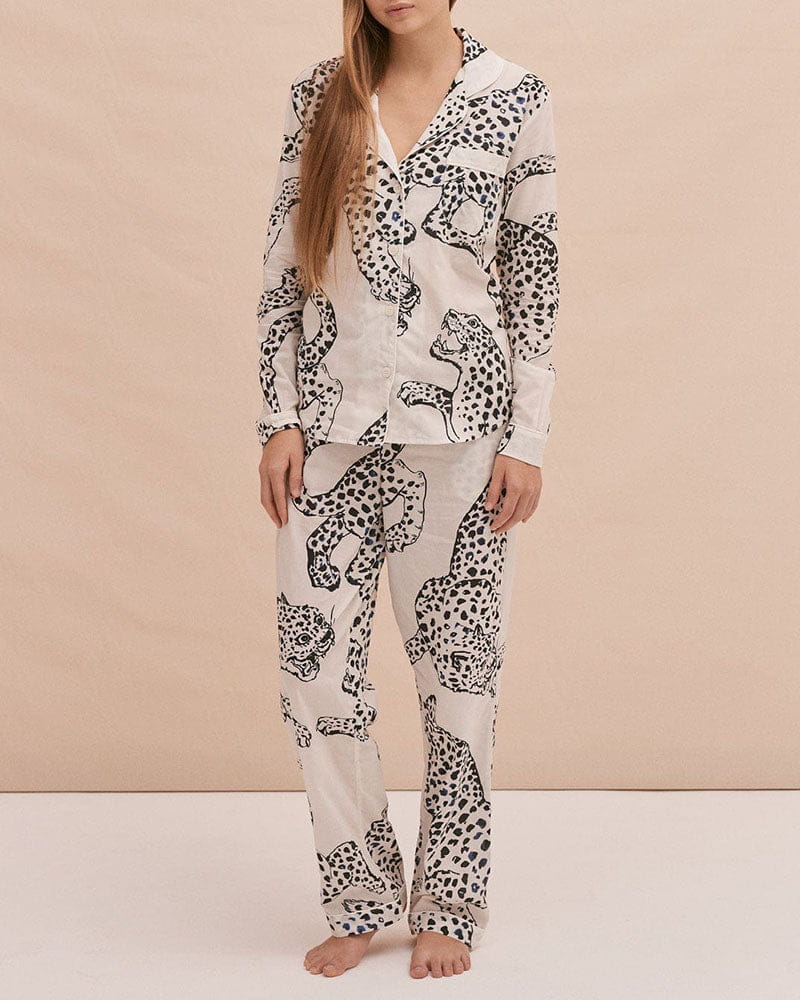 Cotton Long Pyjama Set in Illustrated Leopard Print