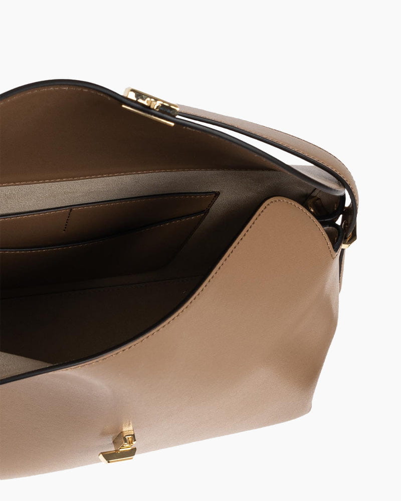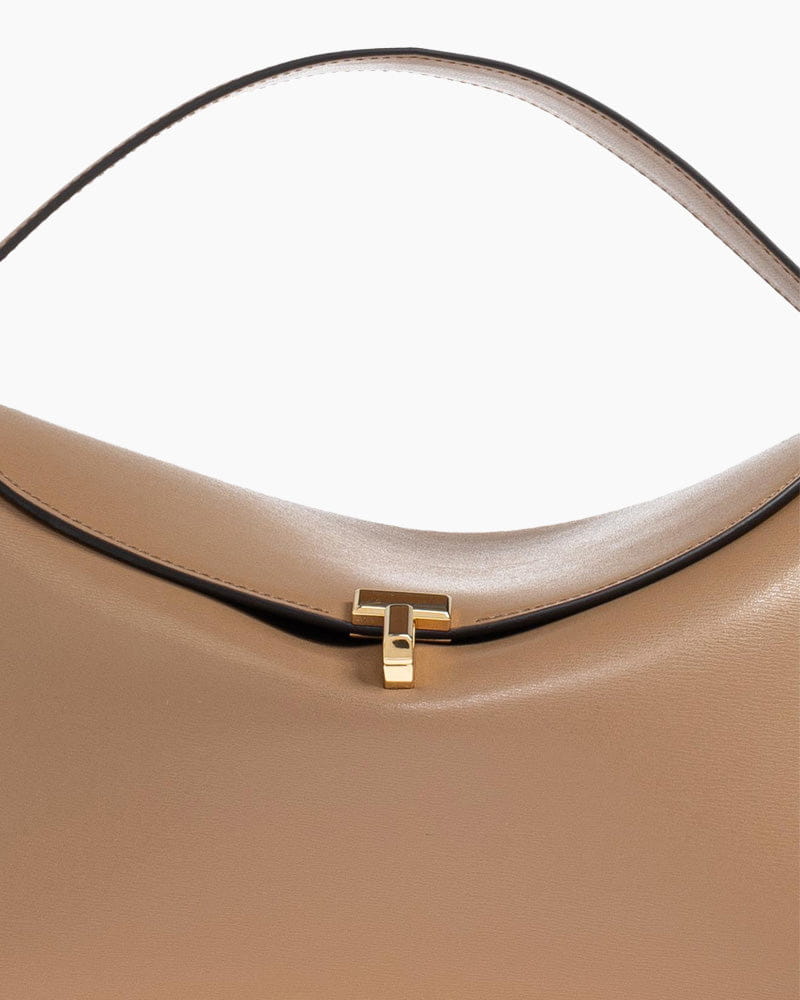 This handbag represents the quintessence of contemporary elegance, presented in different color shades. Its minimalist, soft, trapezoidal silhouette features a refined top and pronounced sides, embodying both sophistication and modernity. Expertly crafted from the finest, slightly PU, the design is anchored by a distinctive T-shaped metal detail that serves as an exquisite clasp.