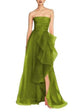 This gown exudes refined drama with a draped bodice and cascading organza ruffle skirt layered over soft tulle. The combination of flowing textures and rich tones creates a glamorous statement piece, perfect for formal events, weddings, or gala evenings.