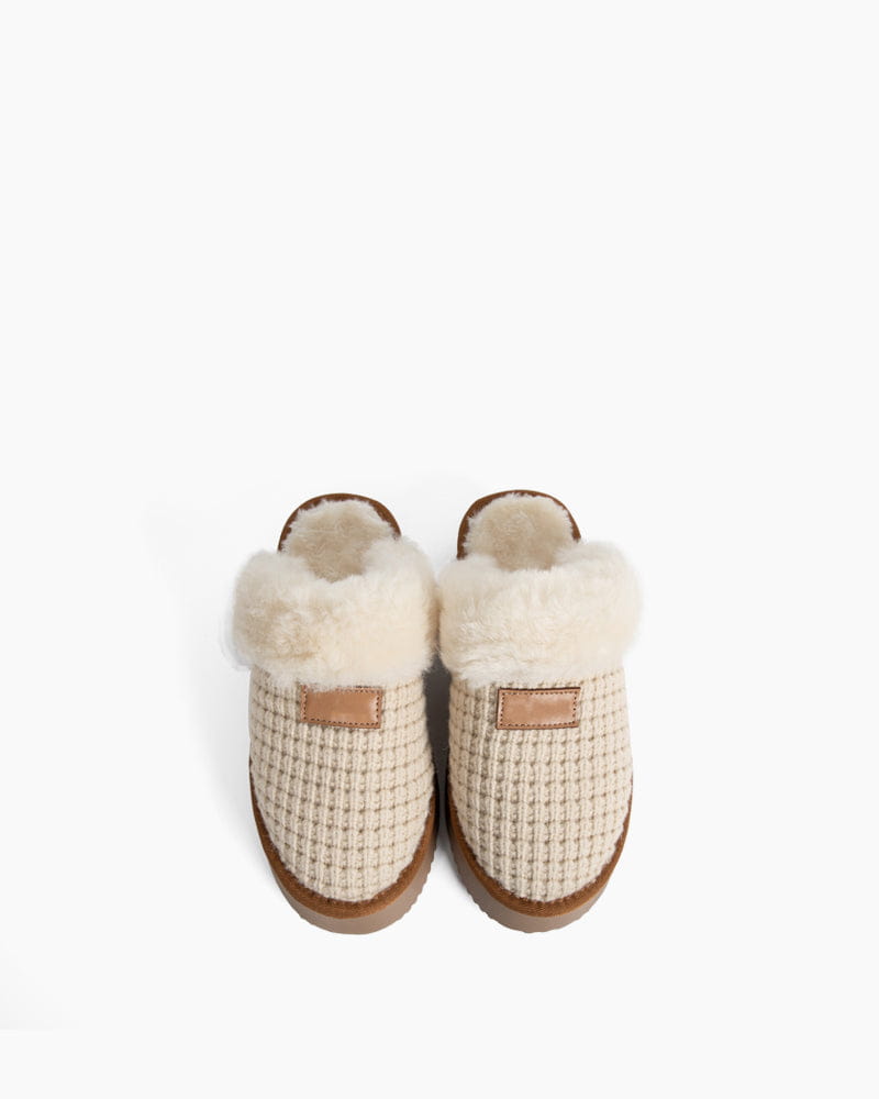 Experience the ultimate comfort and luxury with these knit slippers, designed to keep your feet cozy and stylish. Featuring a soft faux fur trim, plush sheepskin lining, and a fluffy sheepskin collar, these slippers are perfect for relaxing at home. The flat rubber sole offers durability and traction, while the round toe provides a classic and timeless slipper design. Made with high-quality materials sourced from Italy, these slippers deliver warmth, comfort, and style in every step.