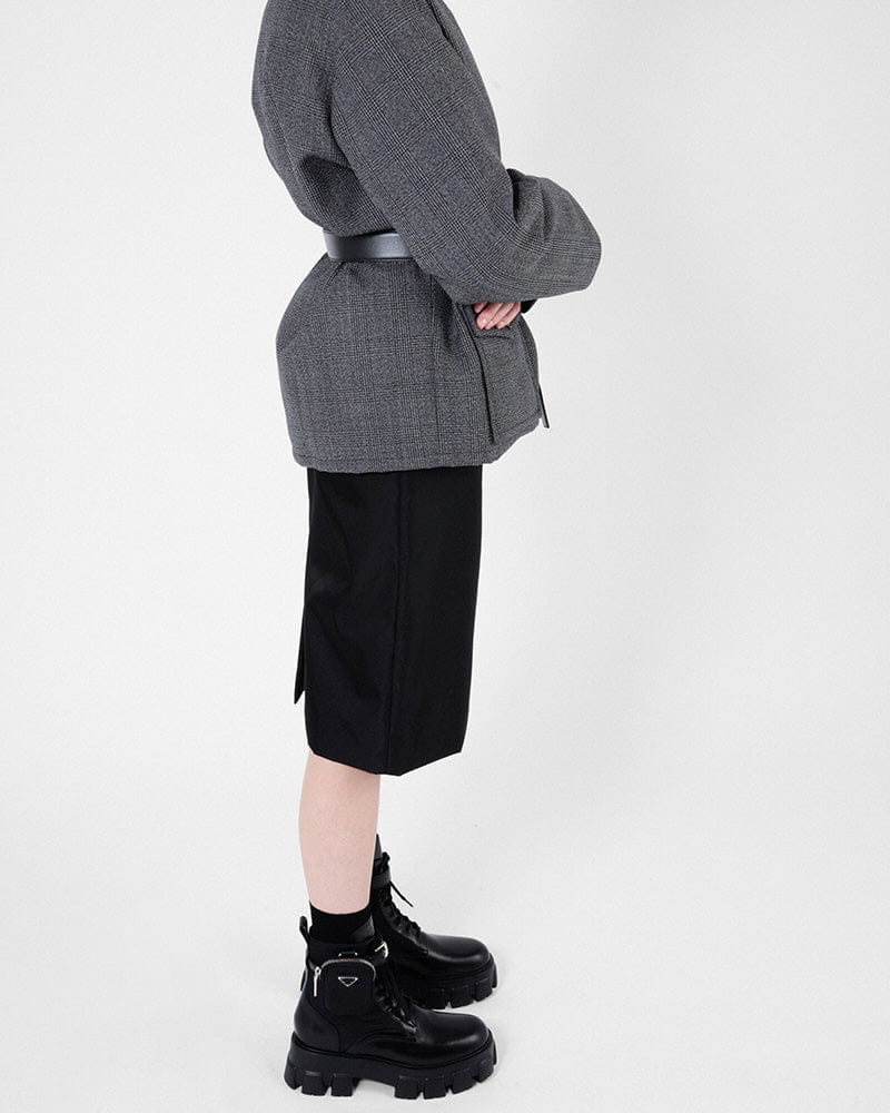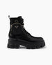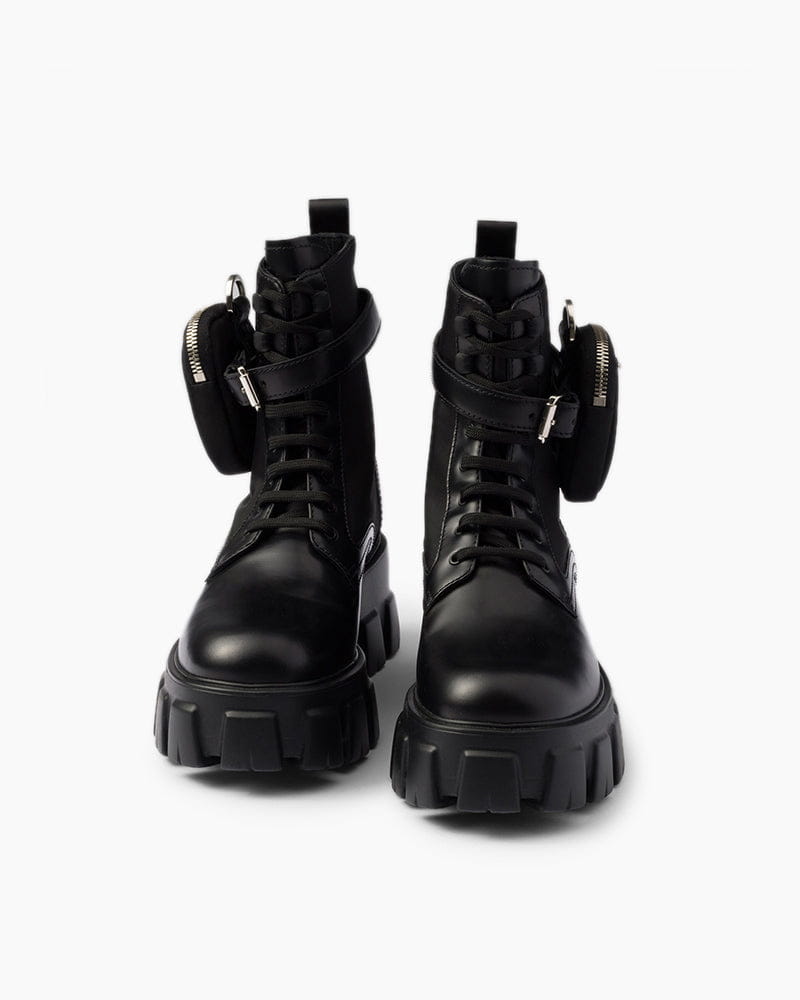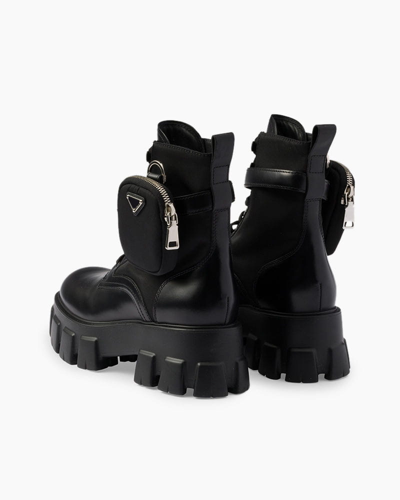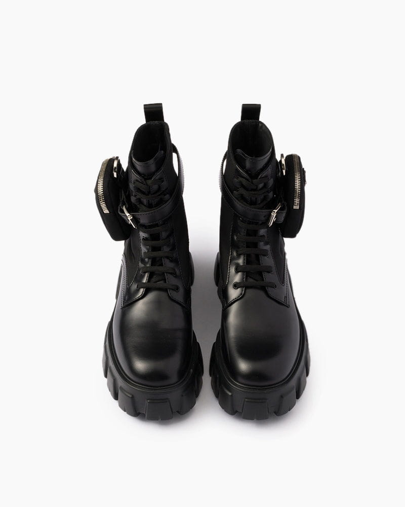 These boots are characterized by their voluminous design and chunky block sole, blending rugged utility with high-fashion stylistic codes. Crafted from premium cowhide, the silhouette is defined by a unique removable pouch attached to the ankle strap, featuring the iconic enameled metal triangle logo. The design is finished with polyester laces, a leather lining, and a durable expanded rubber sole with a lug tread.