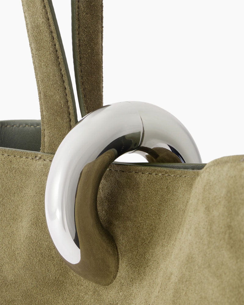 This tote is defined by its structured, asymmetric silhouette, pierced with a chunky silver-tone hoop for a striking visual accent. Italian-made from soft, Genuine Leather, it combines sculptural design with tactile luxury.