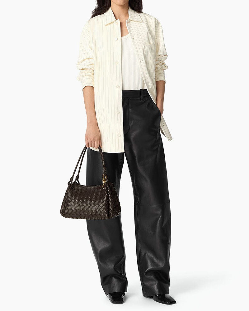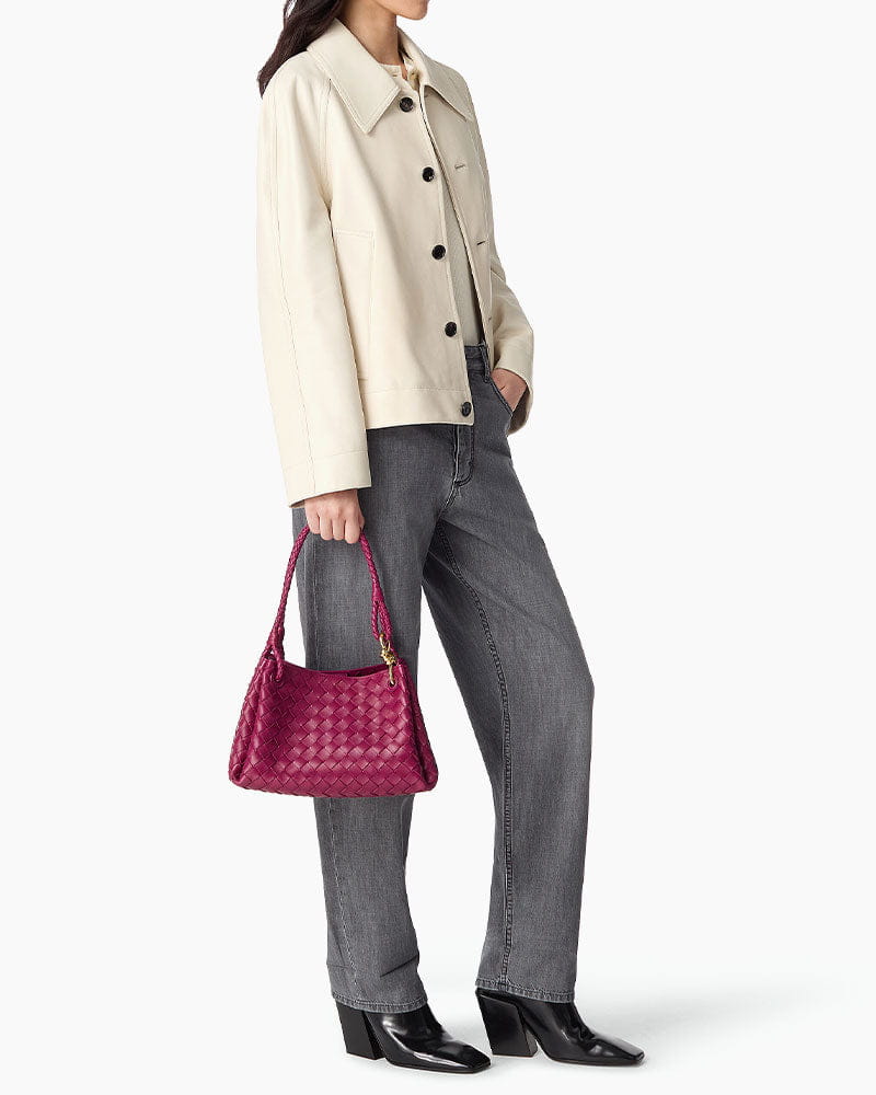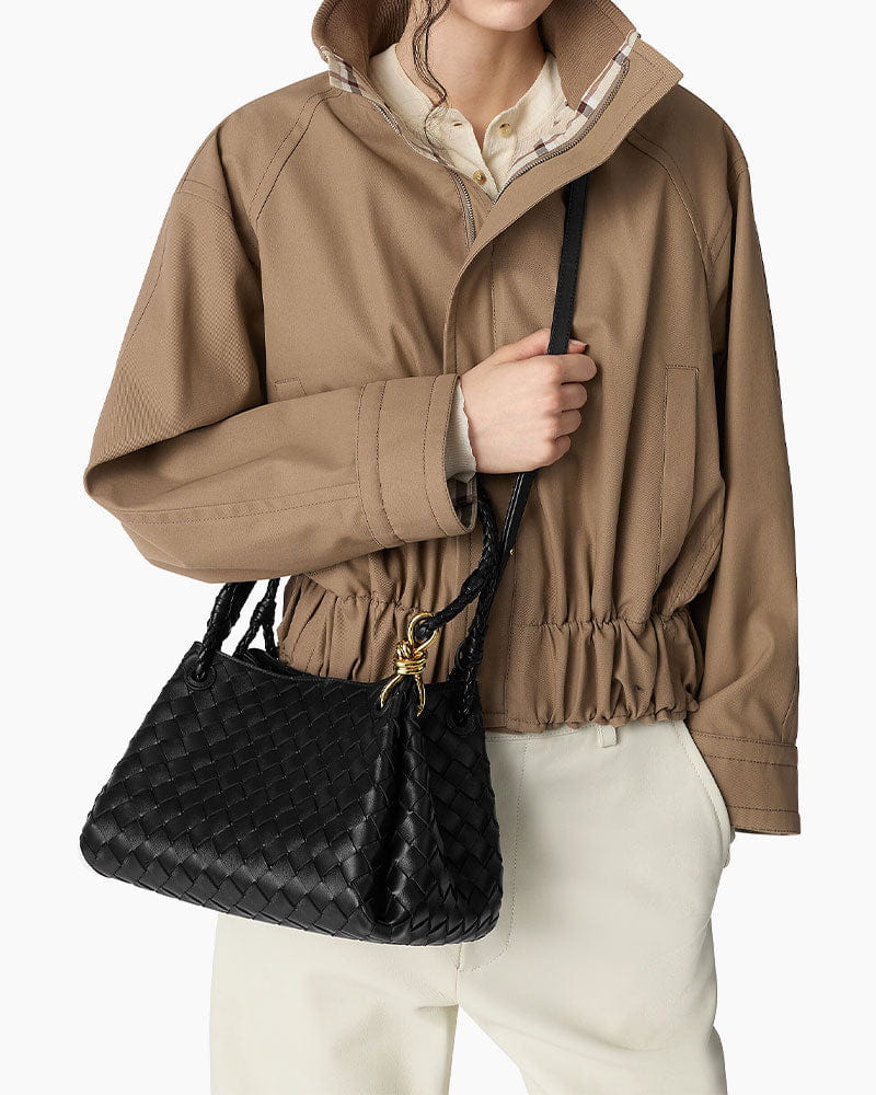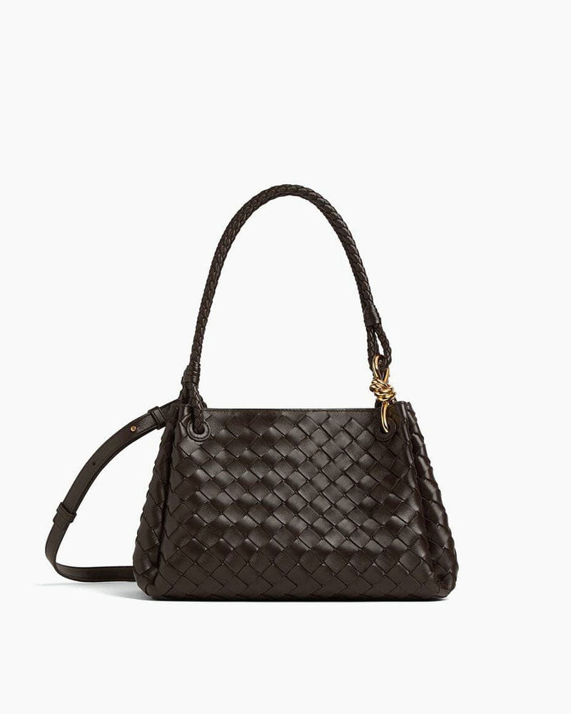 This shoulder bag is crafted from supple Intrecciato genuine leather, featuring a signature knot detail and a detachable cross-body strap for versatile styling. The design includes a single main compartment secured by a magnetic tab closure and is accented with a brass finish. The interior features a genuine leather bonded lining, ensuring cohesive luxury throughout.