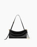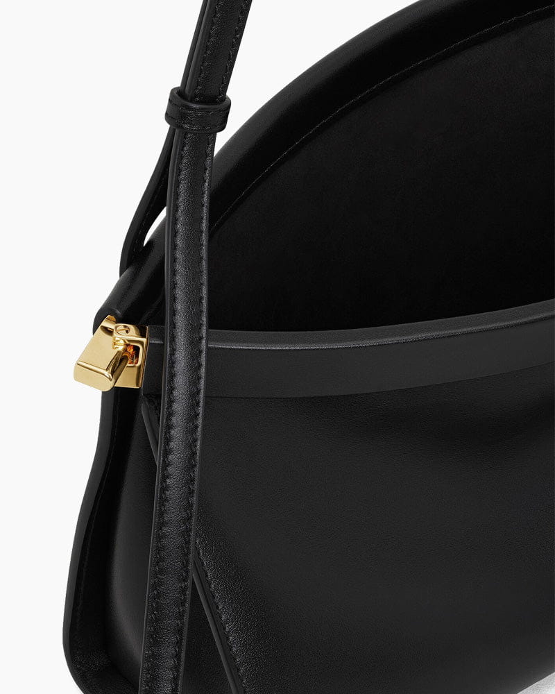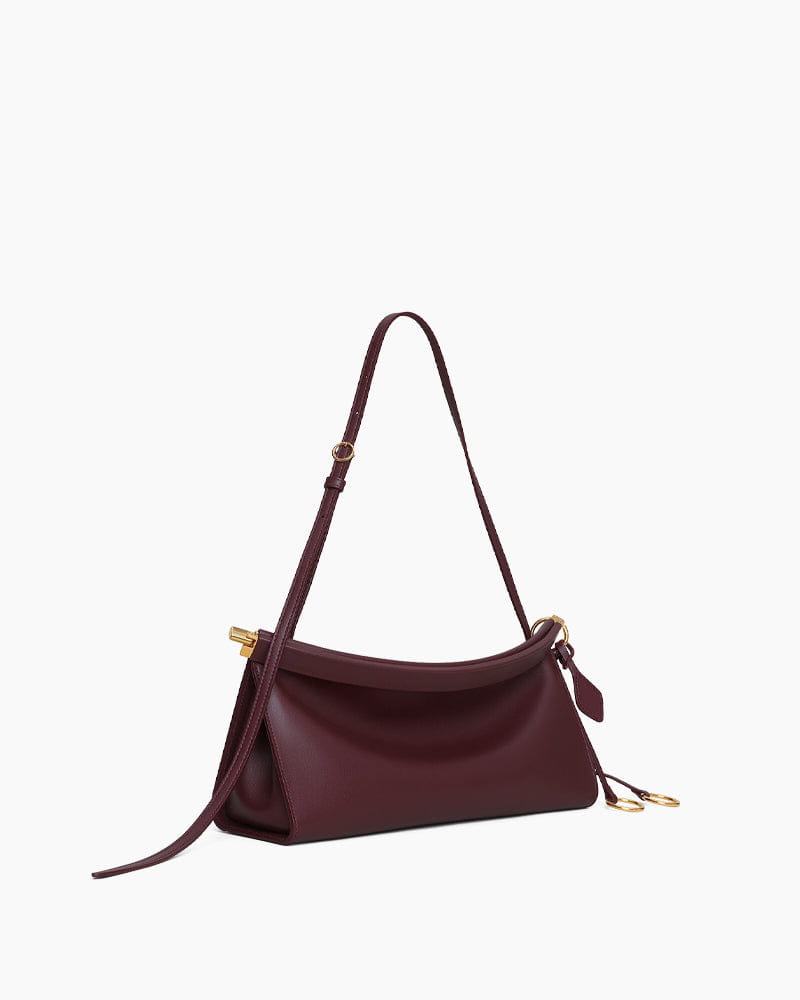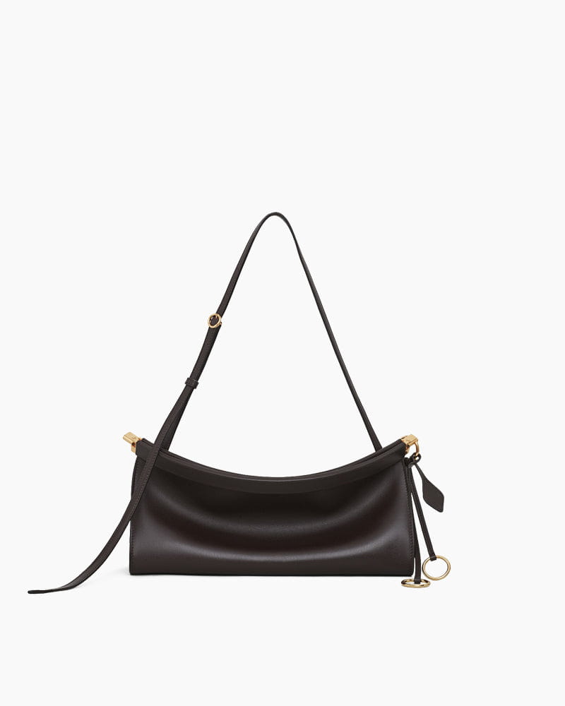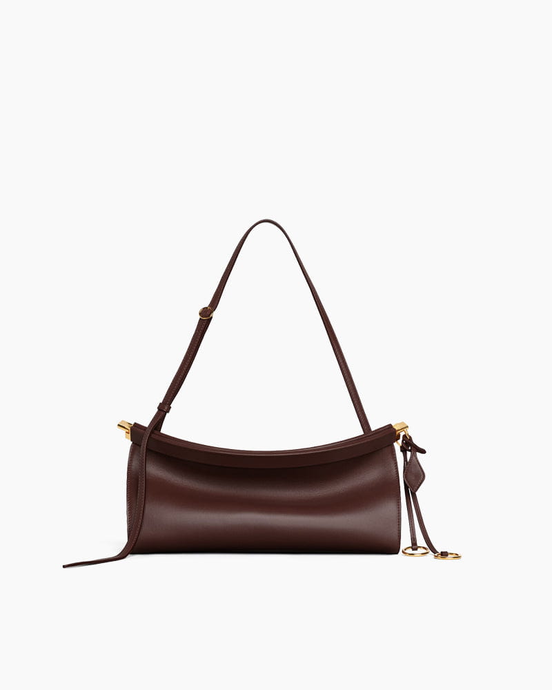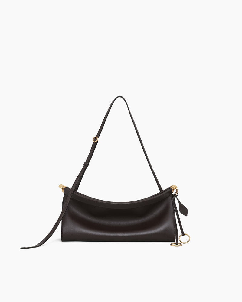 Crafted from glossy genuine leather, this East-West bag features a distinctive curved silhouette designed to closely hug the body for a sleek profile. The unique architecture includes a hinge opening system wrapped in leather and signature folding details at the bottom, adding structural depth. Finished with decorative ties and metallic rings, it offers versatile styling options as both a shoulder and cross-body accessory thanks to its adjustable strap.