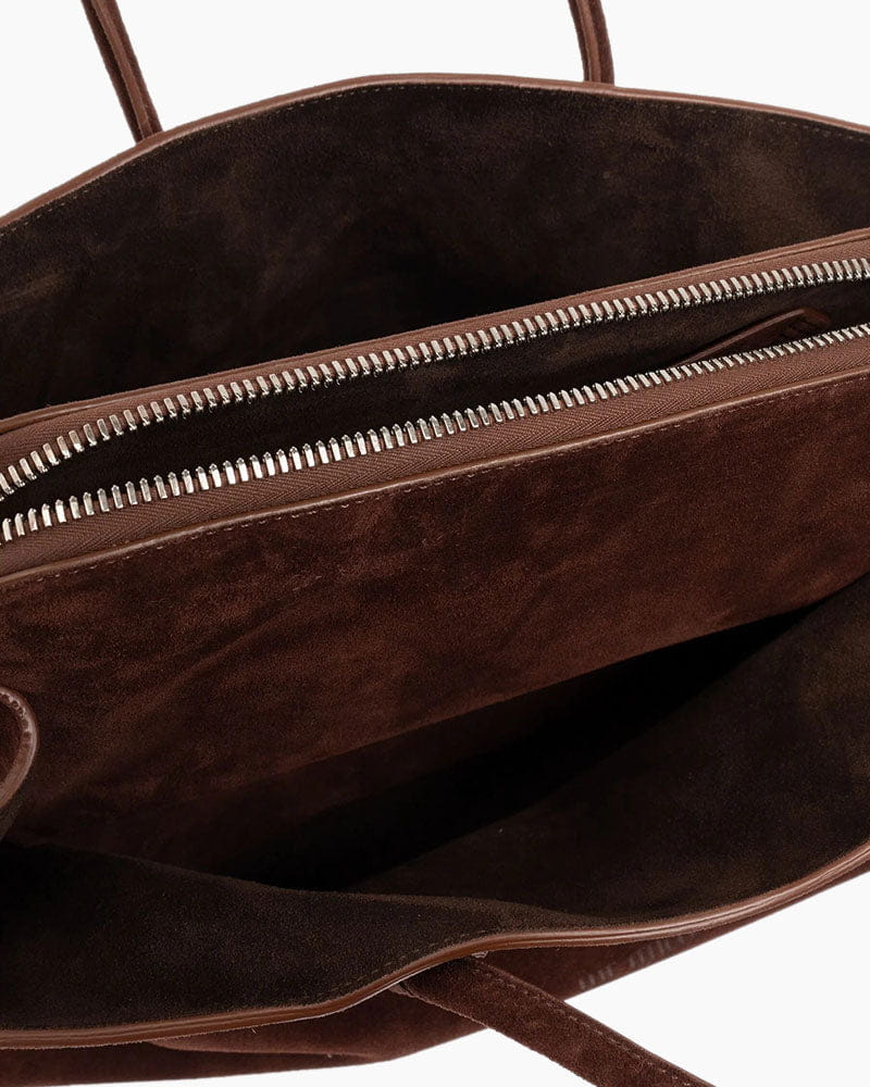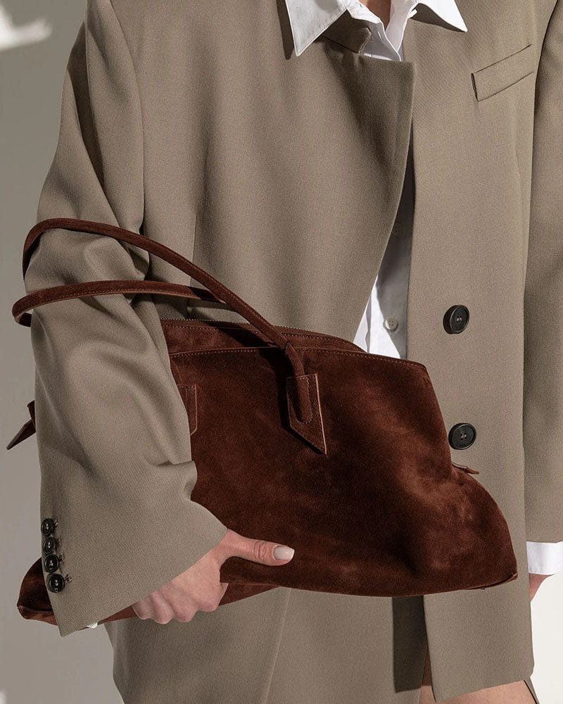This bag is expertly crafted in Italy from suede, offering a luxurious texture and depth of color. The design balances elegance with practicality, featuring a secure two-way zip fastening. Finished with two rolled top handles and flannel lining, it is a refined choice for daily sophistication.