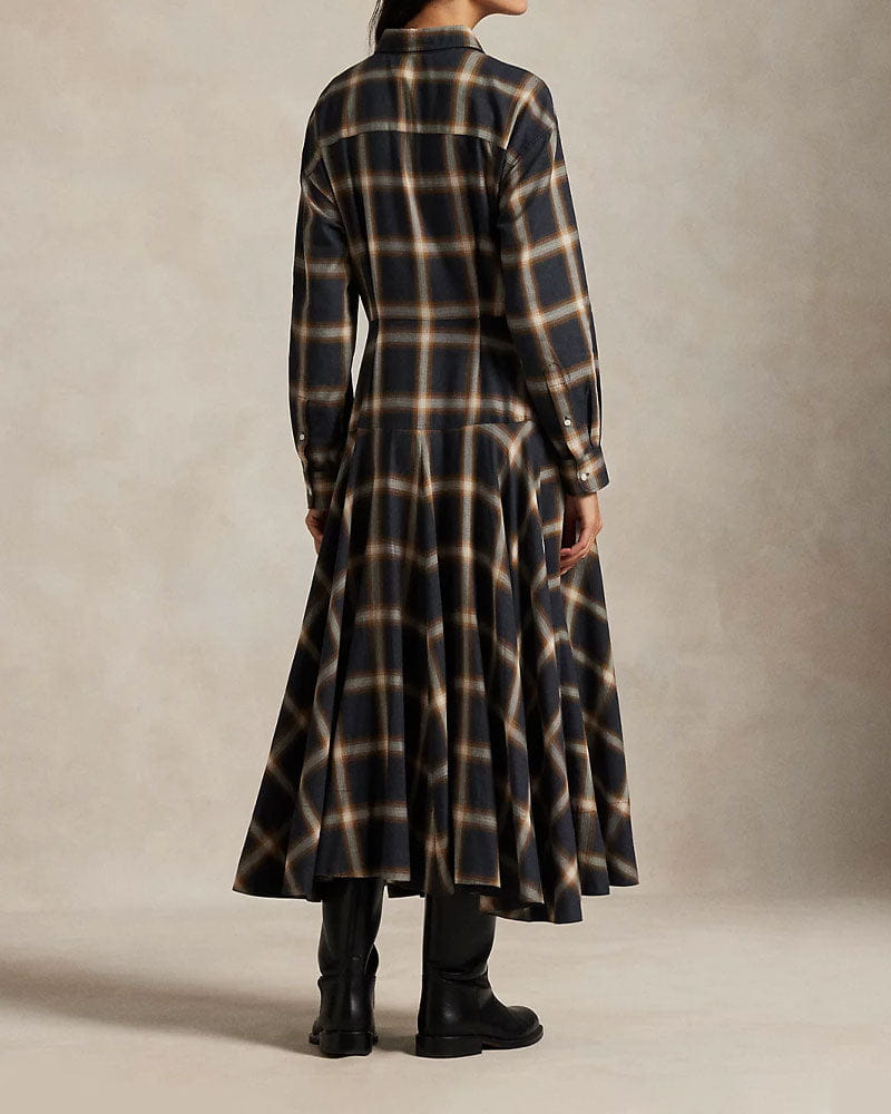 This plaid shirtdress is crafted from left-hand twill and designed with a paneled construction that blends a relaxed bodice with a structured waist yoke and a sweeping A-line skirt. The result is a refined silhouette that moves gracefully and is intended to hit above the ankle.