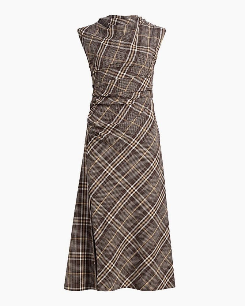 Plaid Asymmetric Cowlneck Midi Dress brings modern sophistication to classic plaid with a high cowlneck and asymmetric draping. Featuring thoughtful details like side slits and a back button keyhole, this piece is as stylish as it is comfortable, perfect for both daytime wear and evening outings.
