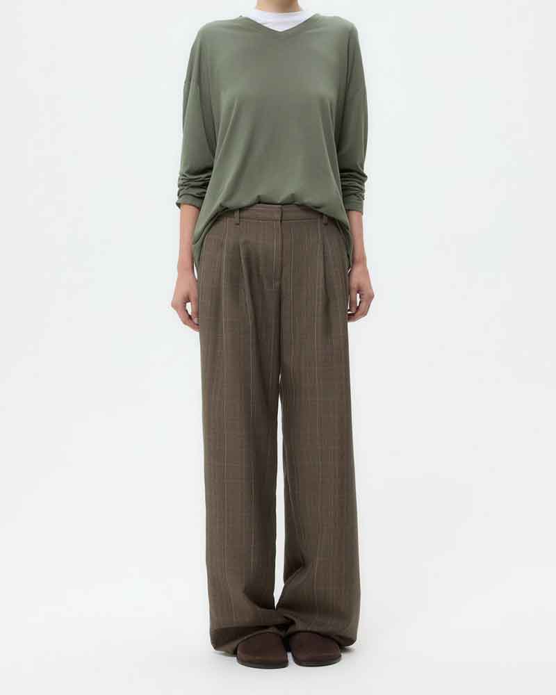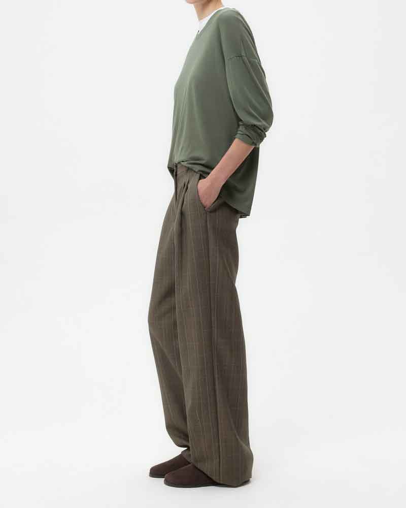 Silhouette: Features a relaxed, straight-leg fit complemented by sophisticated inverted pleats running down the front of the leg.
