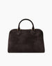Defined by its structured shape that evokes a vintage feel, this handbag is crafted from smooth brown suede. Punctuated with gold-tone hardware, the design features a secure zip fastening along the top and sturdy top handles for an elegant carry. The fully lined interior is practical, offering an internal zipped pocket and a detachable zipped pouch to organize essentials like a wallet, sunglasses, and cosmetics.