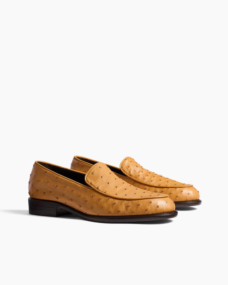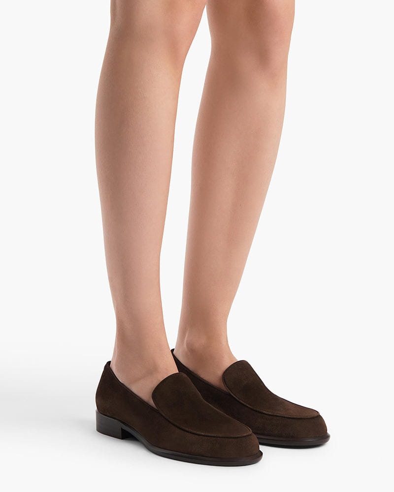 These loafers offer a refined interpretation of a menswear classic, infused with a feminine touch and sublime details. Crafted from rich suede calfskin, the design features a rounded-toe silhouette accentuated by fine-line rolled piping. Finished with a goatskin lining and a signature gold staple at the backstay, they rest on a subtle stacked heel for effortless elegance.