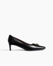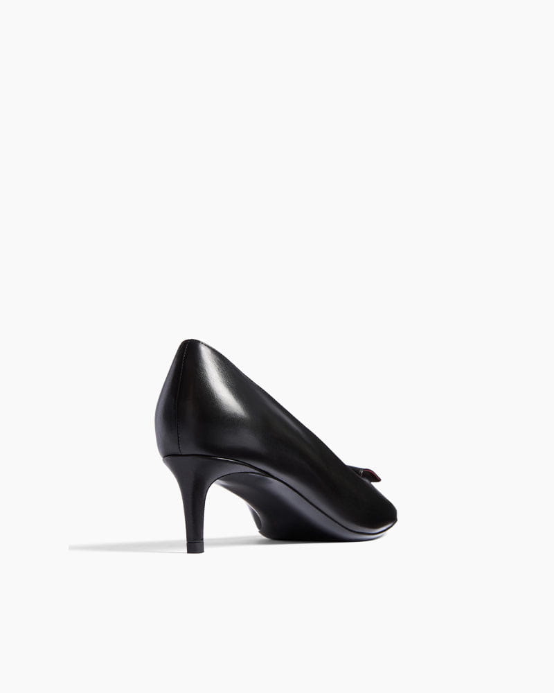 Crafted from vintage calfskin, this loafer-inspired pump is constructed on an elegantly elongated last for a sleek silhouette. The refined design features a snip-toed vamp framed by precise topstitching and is secured by a distinctive gold-tone buckle. Finished with a covered heel and a luxurious contrast suede lining, it blends classic tailoring with modern sophistication.