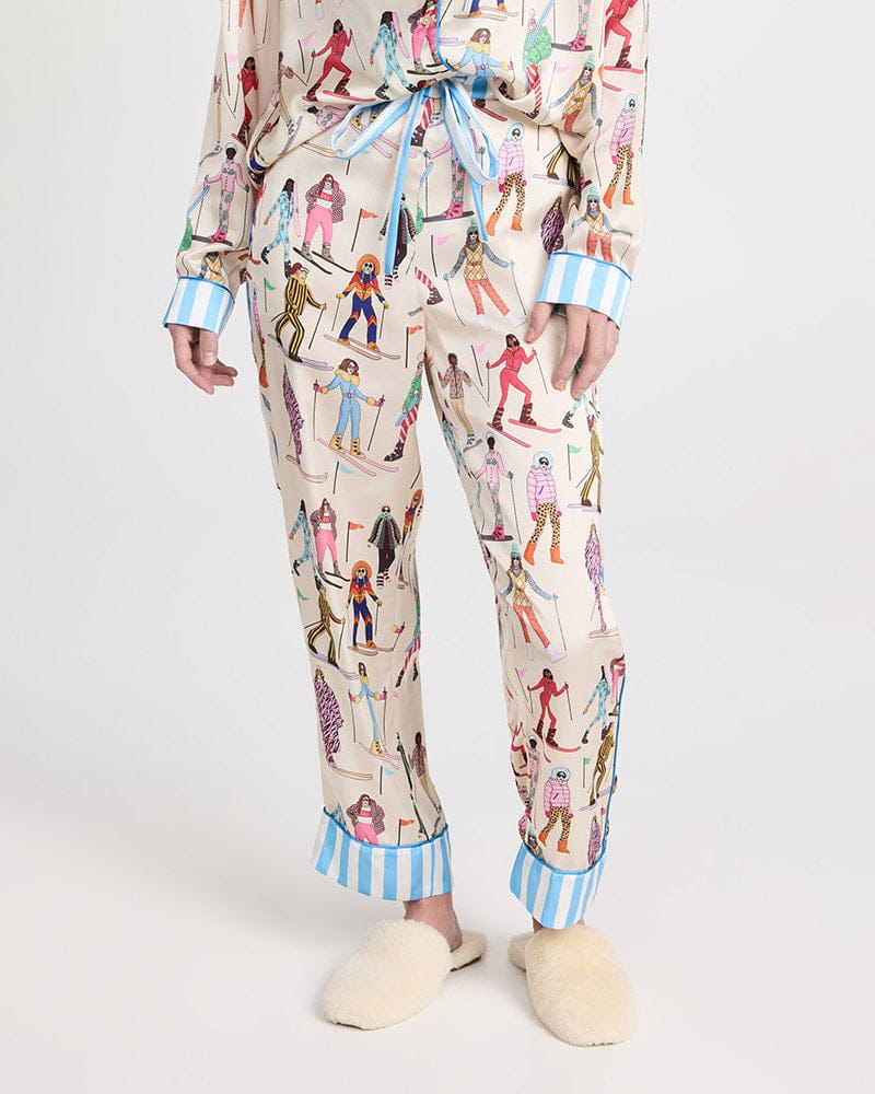 This pajama set captures the excitement of the slopes with a playful ski print, crafted from lightweight, non-stretch charmeuse for a smooth and comfortable feel. The top features a classic collared neck and button placket, stylishly accented with blue and white striped trim on the cuffs and collar. Designed for relaxation, the matching pants include a covered elastic waist with a drawstring for a custom fit and are finished with on-seam hip pockets.