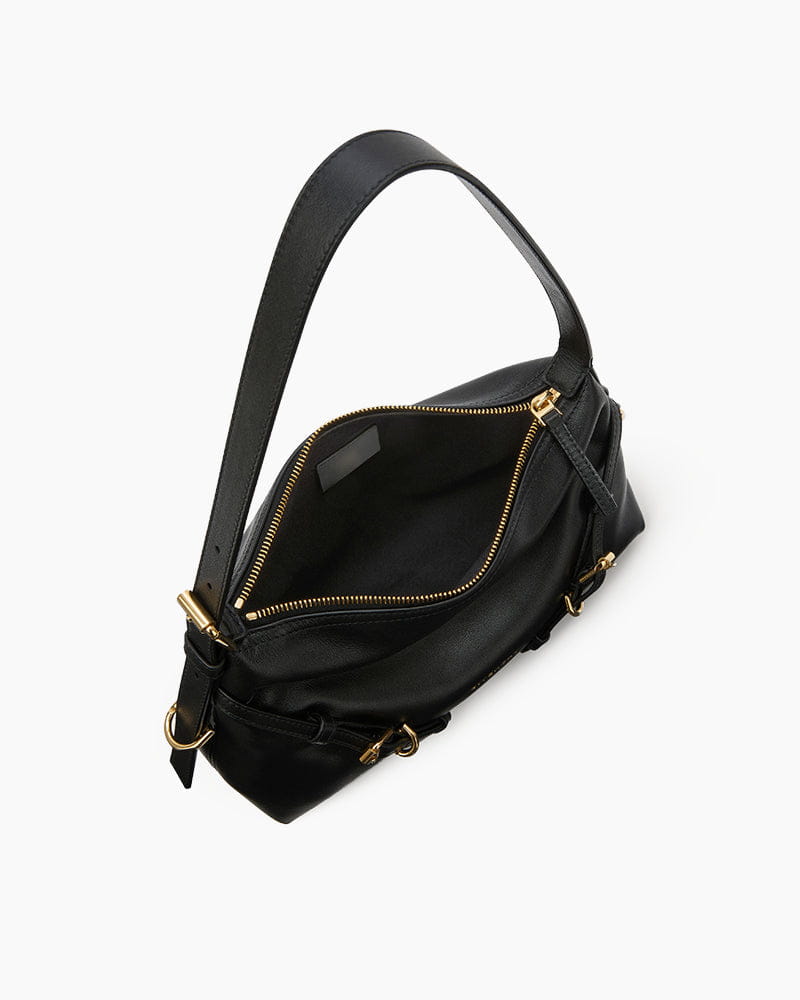 Adjustable leather strap allows for hand, shoulder, or crossbody wear