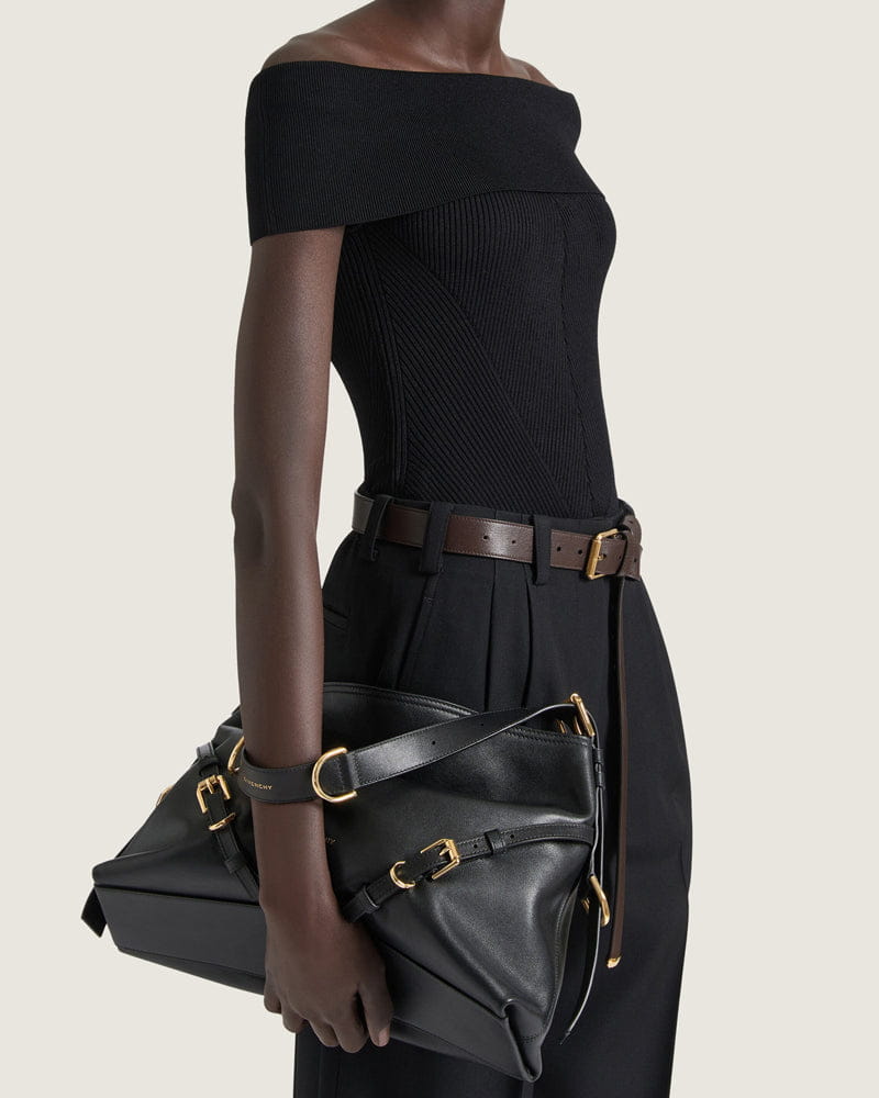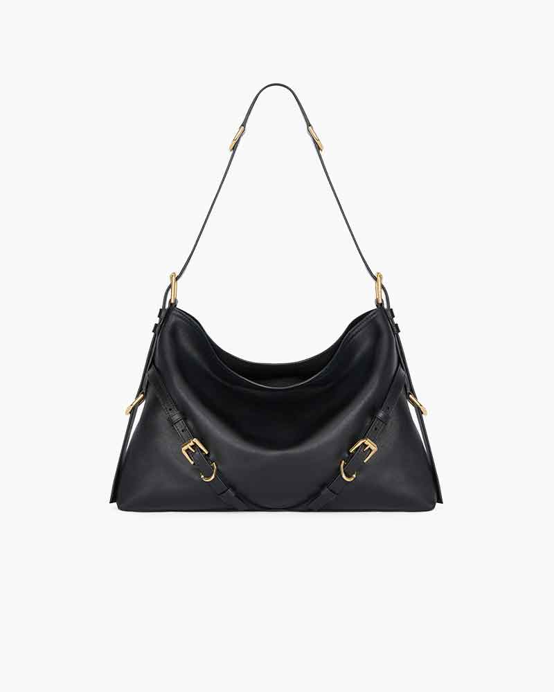 Defined by a distinctive V-shaped slouchy silhouette, this medium shoulder bag exudes a modern, effortlessly cool attitude. Crafted from elevated, smooth, and shiny calfskin leather, it offers generous volume and exceptional versatility. The adjustable strap allows for multiple styling options, making it easy to transition from a hand carry to a shoulder or crossbody look depending on the occasion.