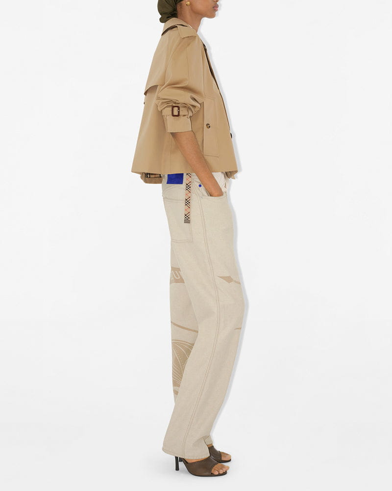 This cropped jacket is a contemporary interpretation of the iconic trench coat, cut to a relaxed fit for effortless style. Crafted from shower-resistant cotton gabardine, it features classic heritage details such as a double-breasted closure, epaulettes, and belted cuffs. The interior reveals a signature Check cotton lining, adding a distinct touch of brand heritage to the lapel design.