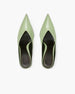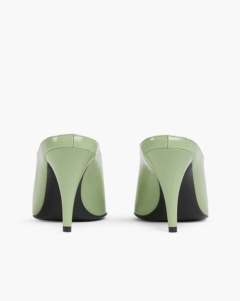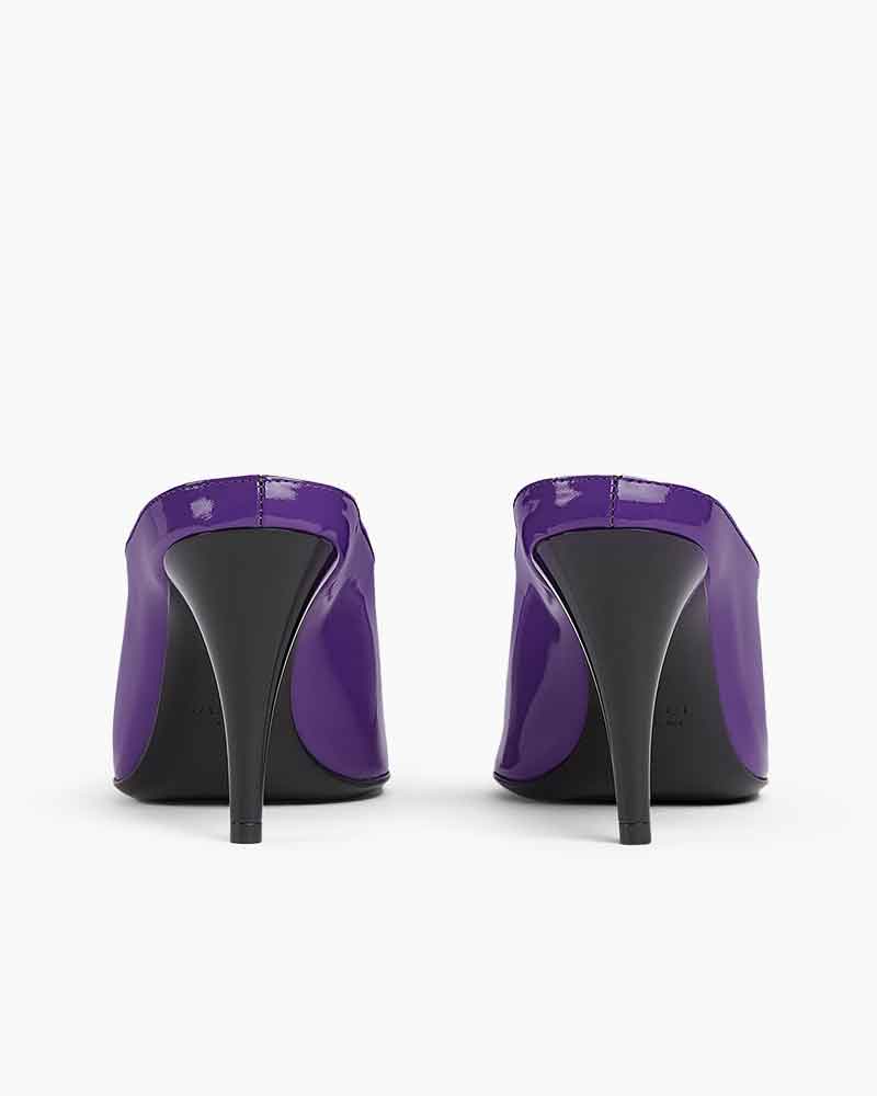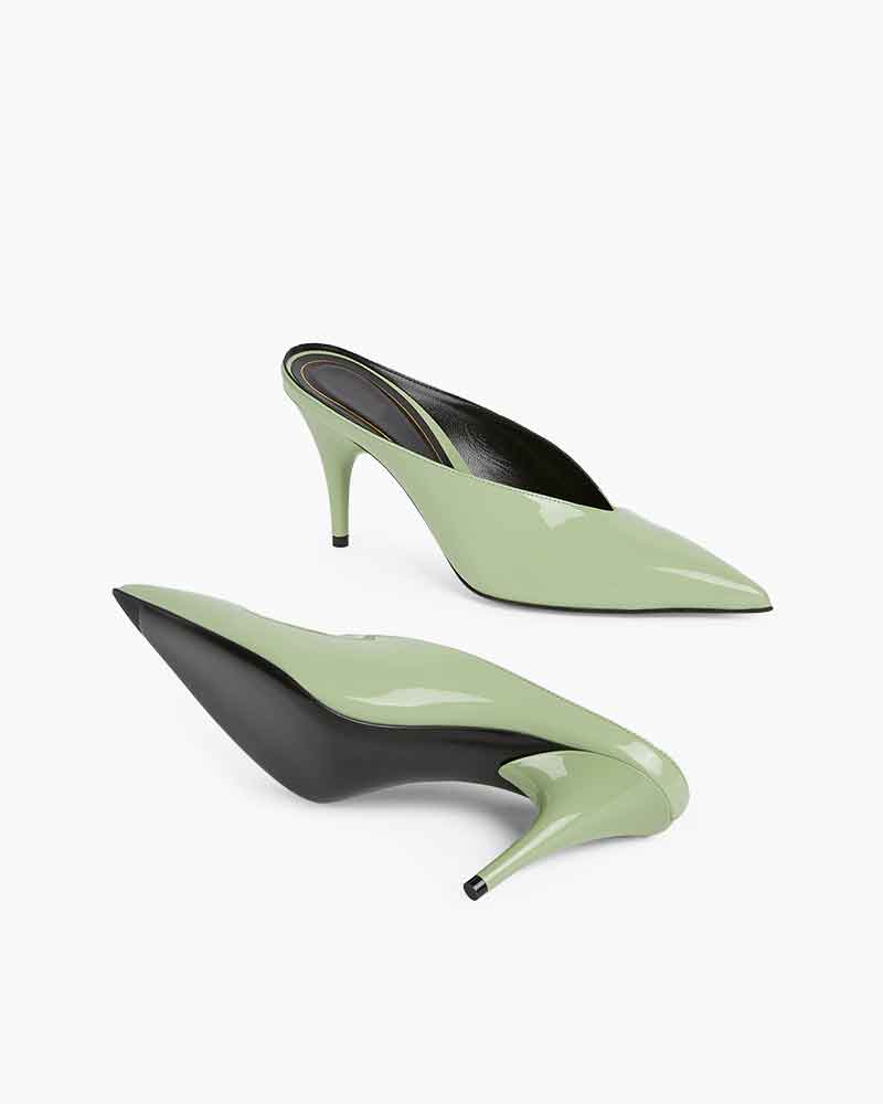 This woman's heeled mule offers a bold expression of femininity. Presented in glossy pastel green and purple PU, it features a sharp point toe and a sleek silhouette that channels contemporary sophistication. The design effortlessly blends retro undertones with modern elegance.