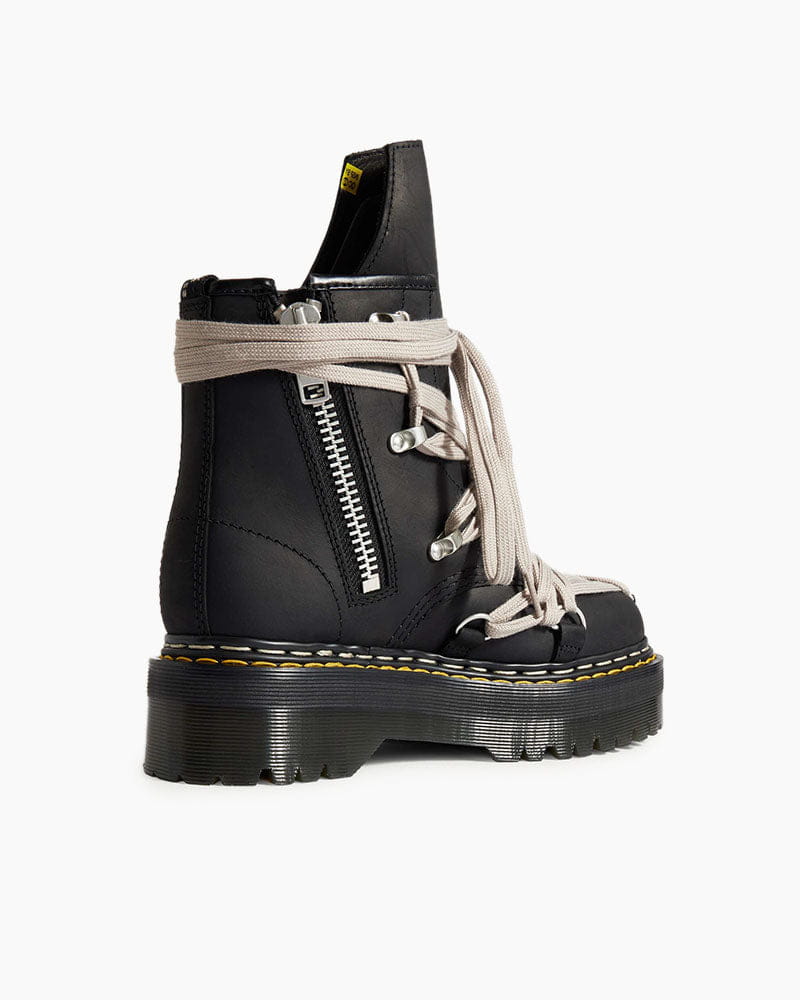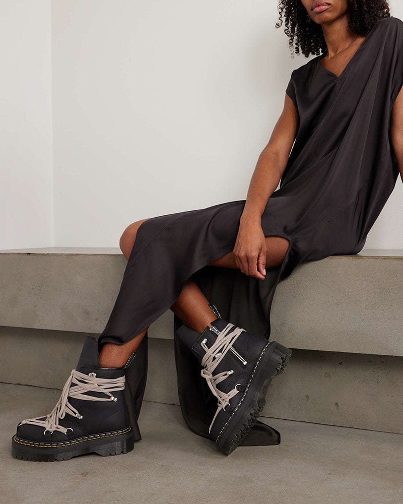 Bold, rebellious, and sculptural — these platform ankle boots reinterpret a classic silhouette through the lens of avant-garde design. Crafted from textured leather, the style features exaggerated tongues, oversized laces that cross the shaft, and a commanding quad sole that defines its fearless character.