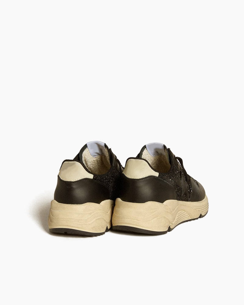 These handmade sneakers fuse urban streetwear with high-fashion glamour. Crafted in Italy, the design features a black Artificial fur upper accented by sparkling black glitter panels and the black leather star. A cream-colored heel provides a subtle contrast to the dark palette, while the chunky rubber sole is treated with a vintage finish for a lived-in look.