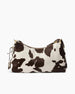 This printed shoulder bag seamlessly blends bold tactile aesthetics with architectural lines. Crafted from luxurious top-grain cowhide, it features a striking brown and white cow print, adding a touch of modern style to the classic Hobo bag shape. Designed for the modern woman, this shoulder bag is complemented by a playful animal print.