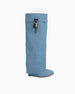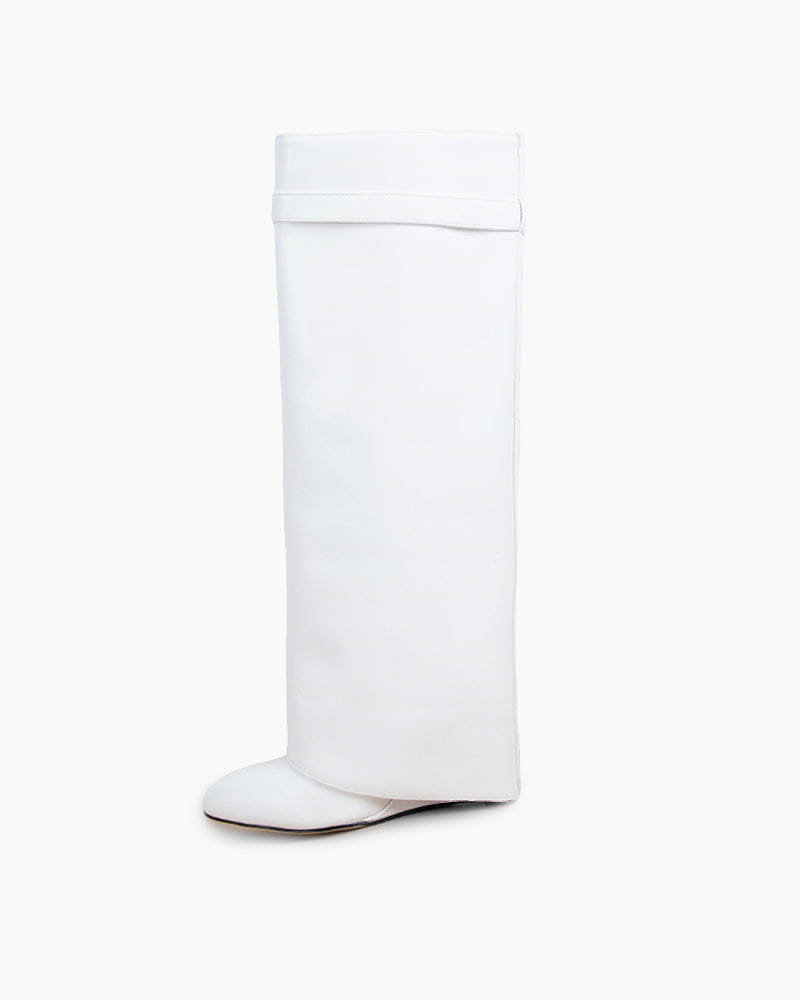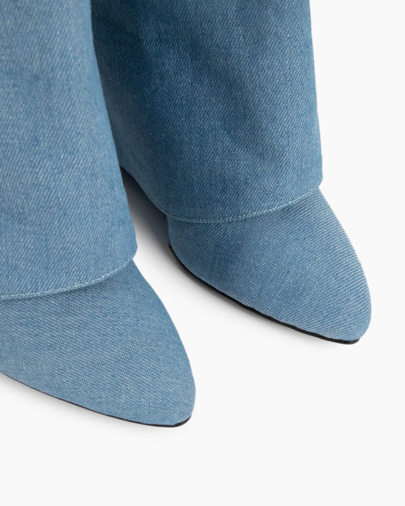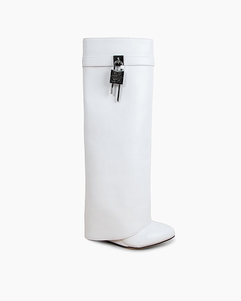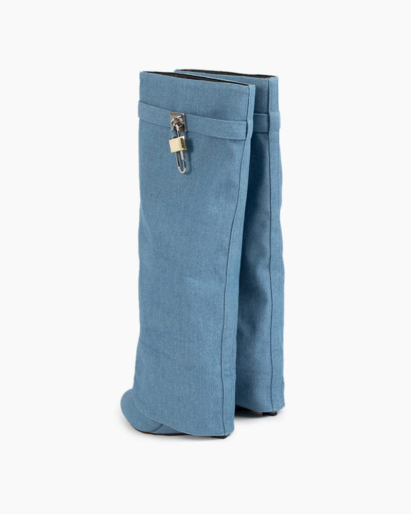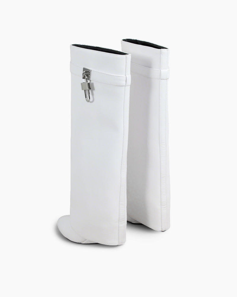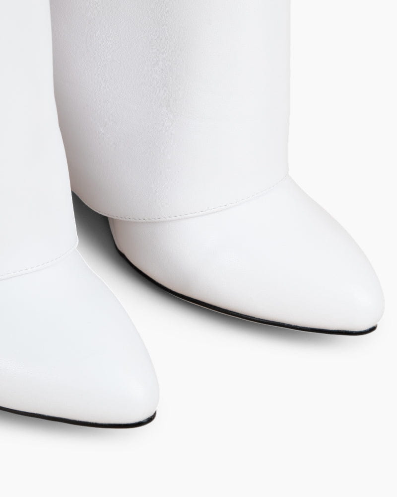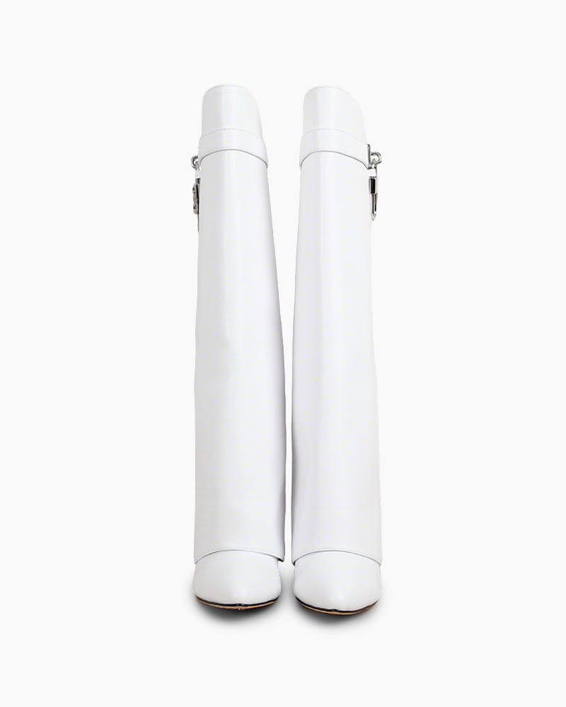 Sleek, structured, and confidently refined, these smooth leather boots balance sharp lines with subtle shine. The pointed toe and visible stitching create a sculpted silhouette, while the gold-tone accents add a modern, polished touch that transitions easily from day to evening.