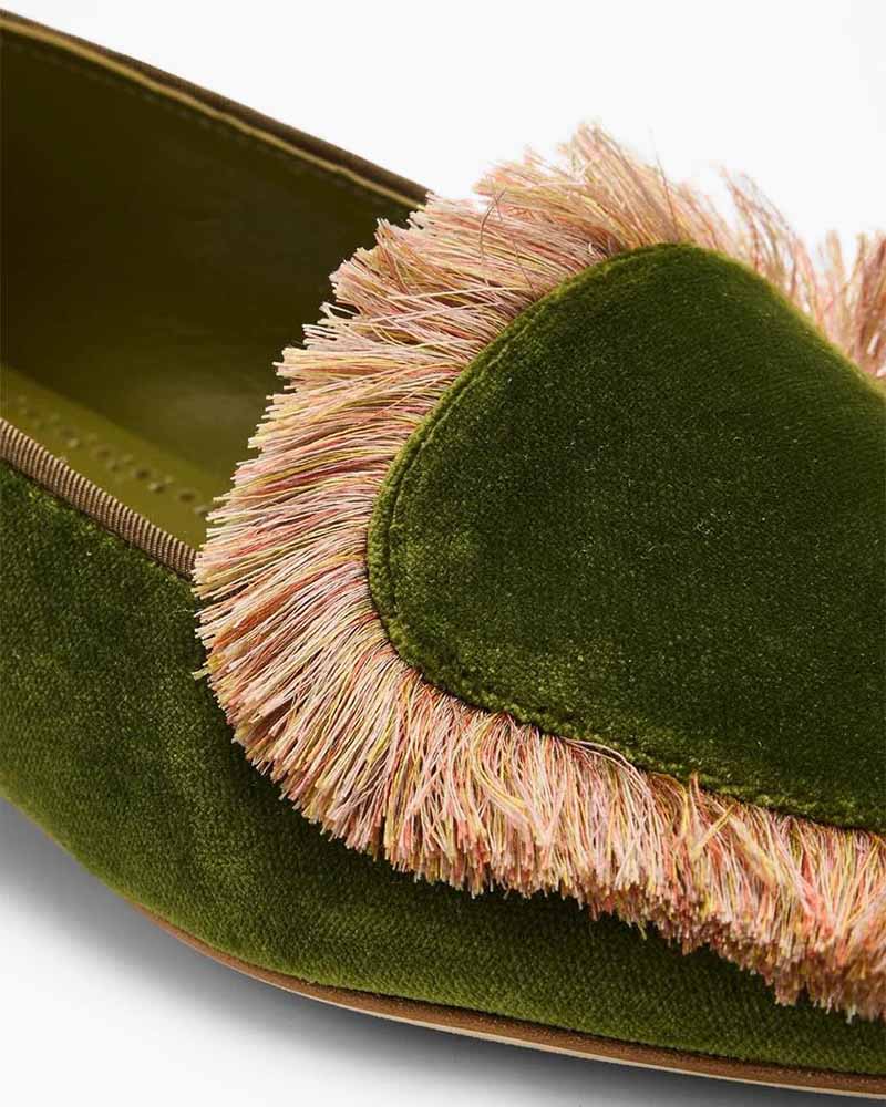 Plush velvet meets sculptural minimalism in these fringe-trim loafers. The pointed toe and notched vamp create a sleek, elongated line, while the subtle 10 mm lift and slip-on construction make them an effortless day-to-evening choice. Hand-finished in Italy for a refined, modern look.