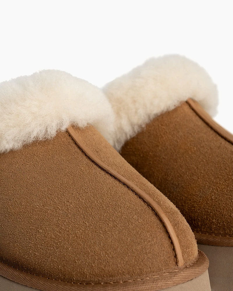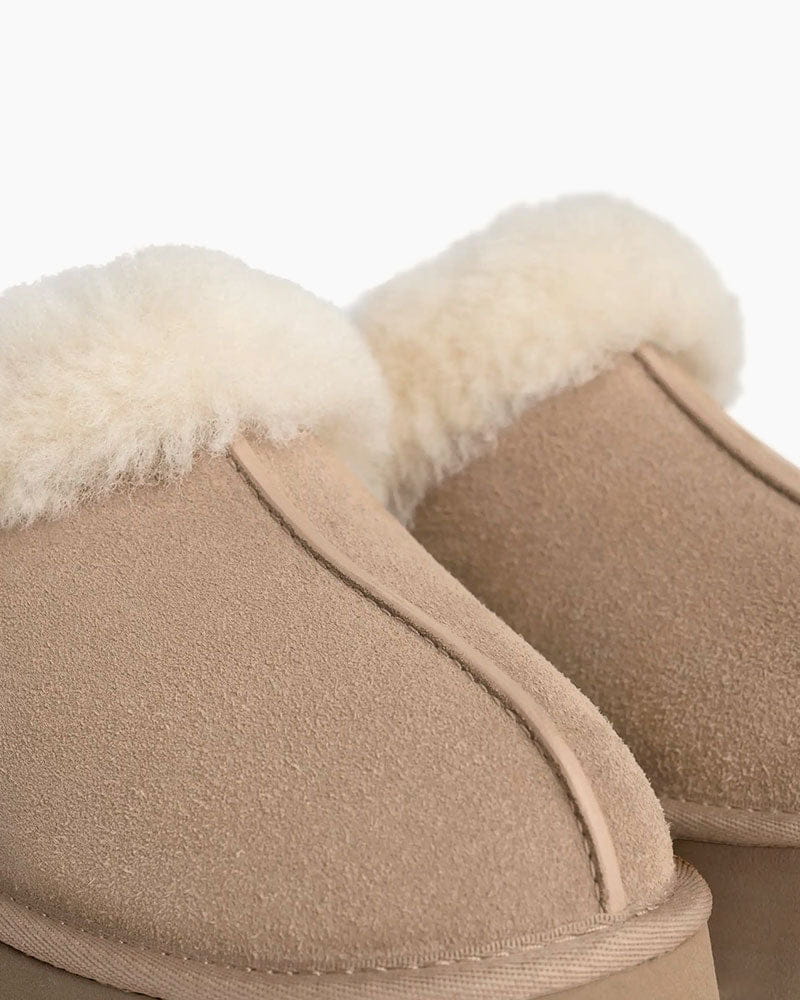 Ready to stand out in style? This mule adds a playful twist to your footwear collection with a retro-style platform sole and a familiar slip-on silhouette. Made from luxurious suede and sheepskin, this shoe is perfect for all-day wear, providing comfort and a bold statement wherever you go. Whether you're looking for something unique or trying something new for the first time, it is designed for those who want to make a statement.