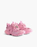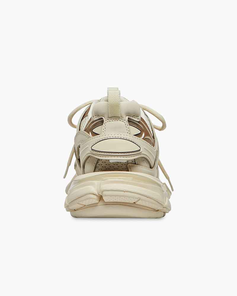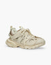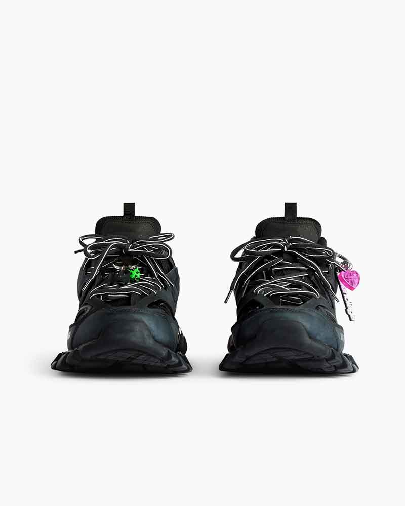 The "Track" sneaker is a statement piece crafted from Top-grain cowhide, artificial leather, and fabric, featuring a complex, high-tech layered design. Distinguished by its dynamic sole with an augmented back for enhanced comfort, the shoe is secured by double laces knotted in a utilitarian style.