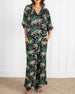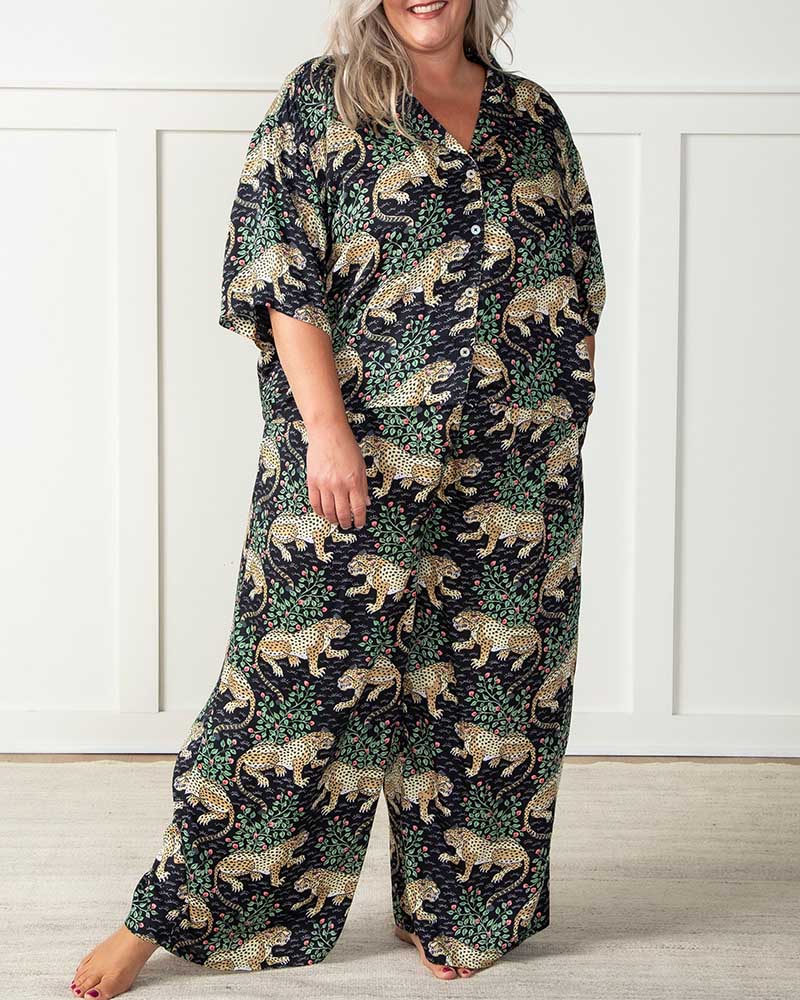 This pajama set is defined by its oversized and roomy silhouette, offering ultimate comfort with a soft, lightweight fabric that drapes beautifully. The design features a vibrant jaguar and foliage print on a dark background, comprising a slightly cropped top with dropped shoulders and matching wide-leg, high-rise pants. Crafted from thermoregulating and breathable material, it keeps you cool throughout the night and is finished with a comfortable pull-on elastic waistband and deep pockets for essentials.