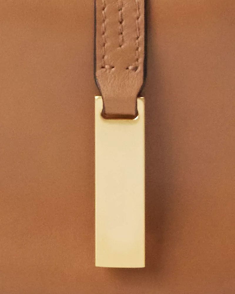 Hardware: Polished brass badge with engraved motif