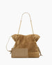 The tote is a lightweight and spacious accessory crafted from premium suede. This elegant bag is defined by topstitching and is prominently displayed. Designed for versatility, the bag features functional drawstring ties that allow the sides to be cinched or expanded, instantly transforming its silhouette to suit your needs.