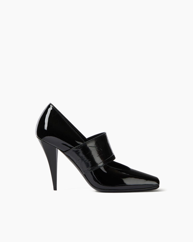 These leather pumps bring together a modern sculptural silhouette with a bold, graphic touch. The sliced square design and low décolleté create a clean, architectural profile, while the wide strap adds a distinctive accent. Finished with a curving cone heel, they offer a striking balance of style, structure, and everyday wearability.