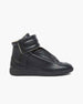 These sneakers embody a sleek, avant-garde aesthetic with their futuristic high-top silhouette. Expertly crafted in Italy from smooth black Top-grain cowhide, the design is defined by clean lines and a concealed lace placket that creates a seamless, minimalist look. The shoe is constructed with a distinctive padded ankle strap and a durable rubber sole.